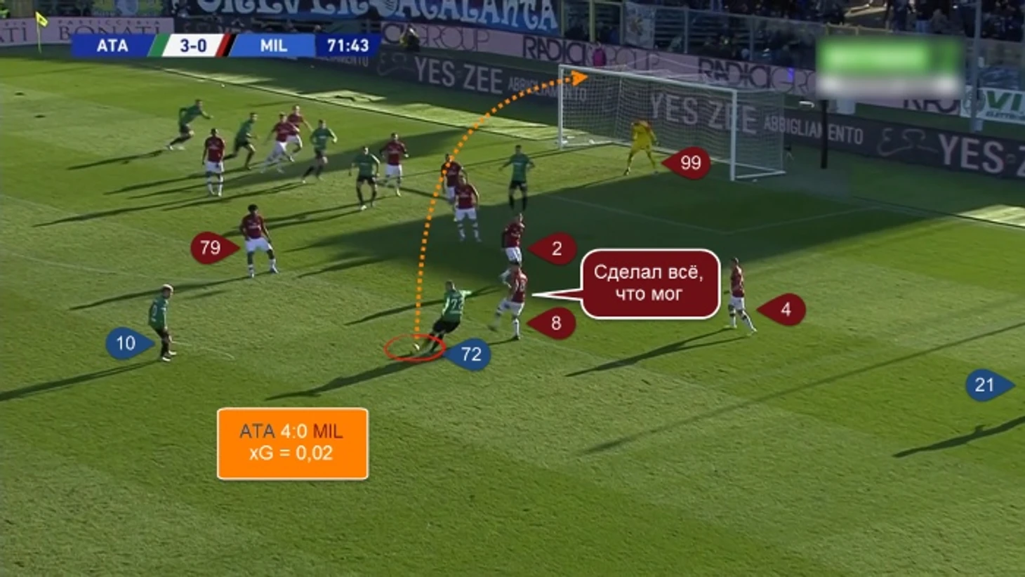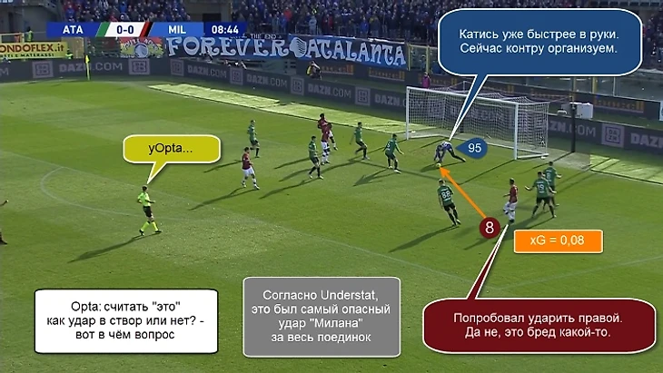 19. Пашалич, Муриэль и Госенс разыграли слева комбинацию “пас на третьего”. Немец ворвался в штрафную и пронзил её поперечной передачей на дальнюю штангу. Кастань бил с 6 метров в пустой угол - Доннарумма телепортировался с центра и отбил. Мяч срикошетил от 21 номера хозяев и снова полетел в ворота, но Калабрия вынес его с ленточки.