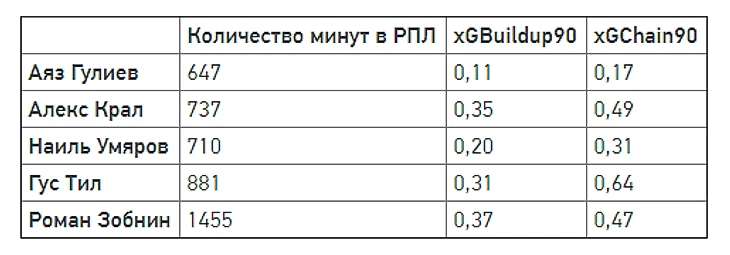 Однако наиболее важные показатели в данном случае — xGBuildup90 (вклад игрока в атаки, завершившиеся ударами с определенным xG, но без учета передач под удар и непосредственных ударов/90 минут) и xGChain90 (то же самое, только с учетом передач под удар и ударами/90 минут).