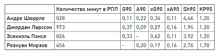 В целом показатели у нападающих «Спартака» довольно ровные. При этом Понсе и Ларссон уже начинают сыгрываться, действуя в соответствии с четко определенными ролями второго форварда и завершителя атак, а Мирзов выполняет большую работу по продвижению мяча.
