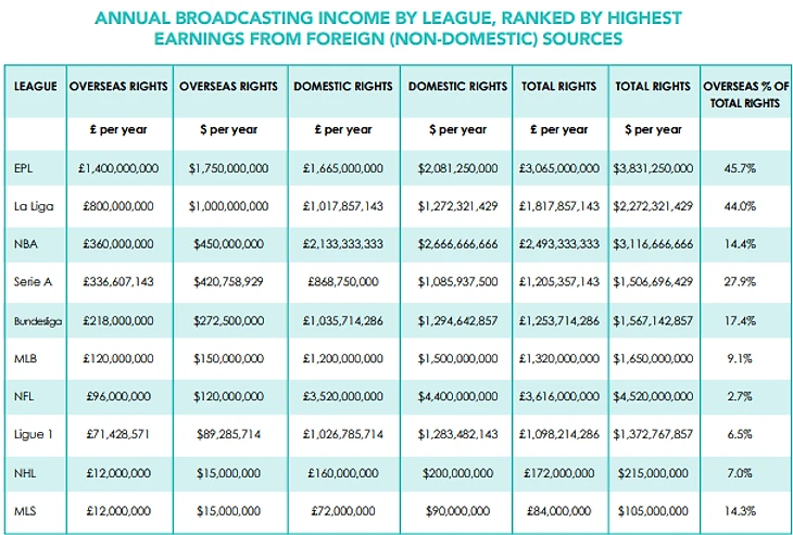 По доходам АПЛ самая высокодоходная футбольная лига мира, за 2019 год от продаж прав на трансляции игр и рекламы АПЛ заработала 3 831 250 000$, к сравнению испанская ЛаЛига отстает по доходам существенно (2 272 321 000$) , немецкая Бундеслига идет на 3 месте по доходам 1 567 142 857$. Интересный показатель в таблице "overseas %" , которой показывает какой процент от общих доходов приходится на продажу прав и рекламы за рубеж.У АПЛ 45% доходов приходит от продажи прав на трансляции за границу, у ЛаЛиги 44%, у Бундеслиги 17%. Самая высокодоходная лига мира - это конечно - Национа́льная футбо́льная ли́га (НФЛ) (англ. National Football League (NFL)) — профессиональная лига американского футбола в США, доходность которой за 19 год составила 4 520 000 000$ , учитывая еще тот фактор , что все эти деньги они зарабатывают исключительно на продаже прав на трансляции внутри страны, доход от продажи прав за границу всего 2.7% . Данные по НХЛ,НБА и другим лигам смотрите в таблице
