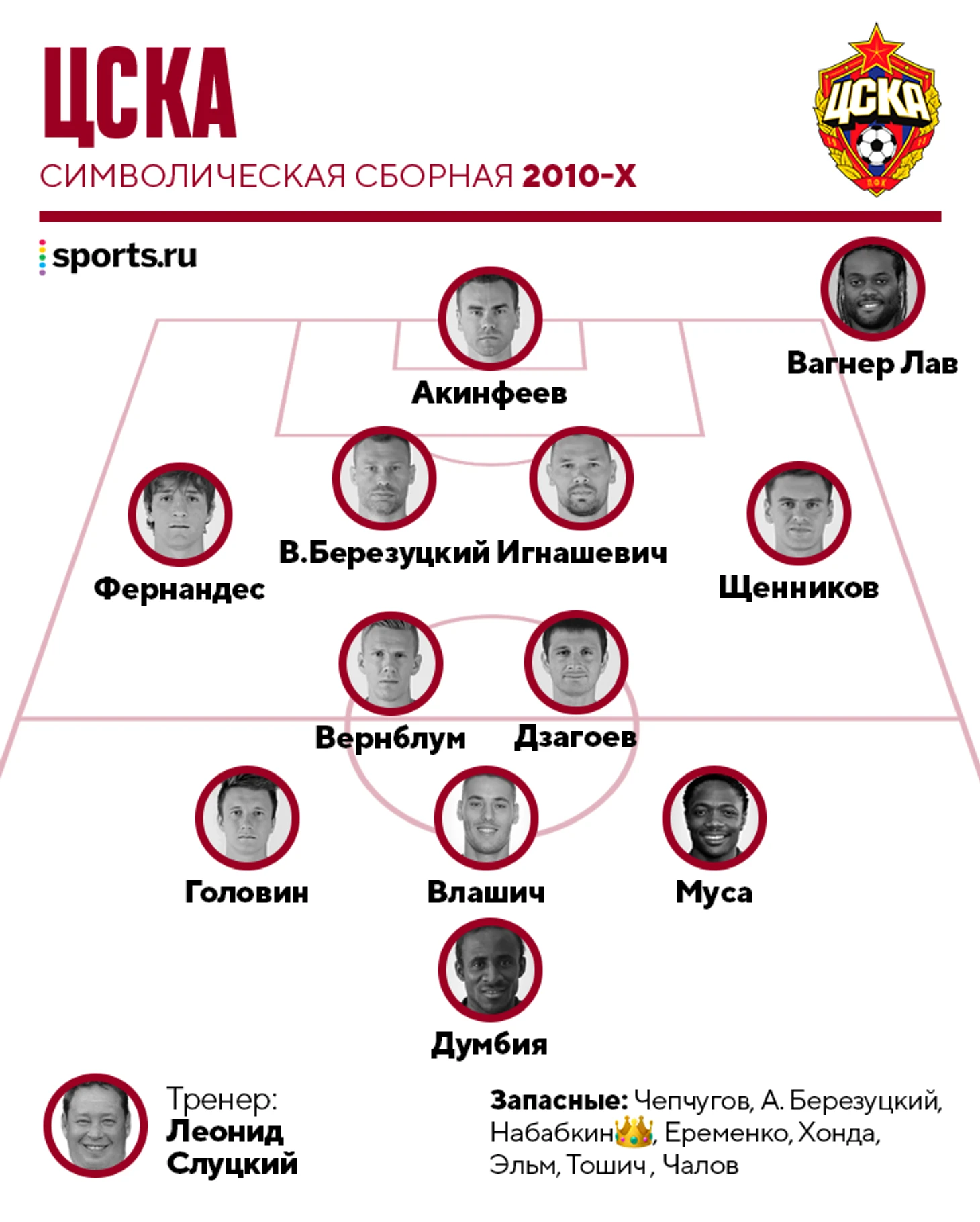 Постоянные выходы в группы еврокубков с 2004 года (кроме сезона-2012/13, когда проиграли АИК) и регулярная тройка лидеров РПЛ – это суперудачно. А тренер, который собрал команду, – конечно же, Леонид Слуцкий. Его можно сколько угодно критиковать за грустный стиль игры, за надоедливые искусственные офсайды и трусость в Лиге чемпионов, но все трофеи ЦСКА в десятилетии (кроме последнего Суперкубка) – его. Все любимые легионеры (за исключением Влашича) – его. Чемпионство на одном Мусе – его.