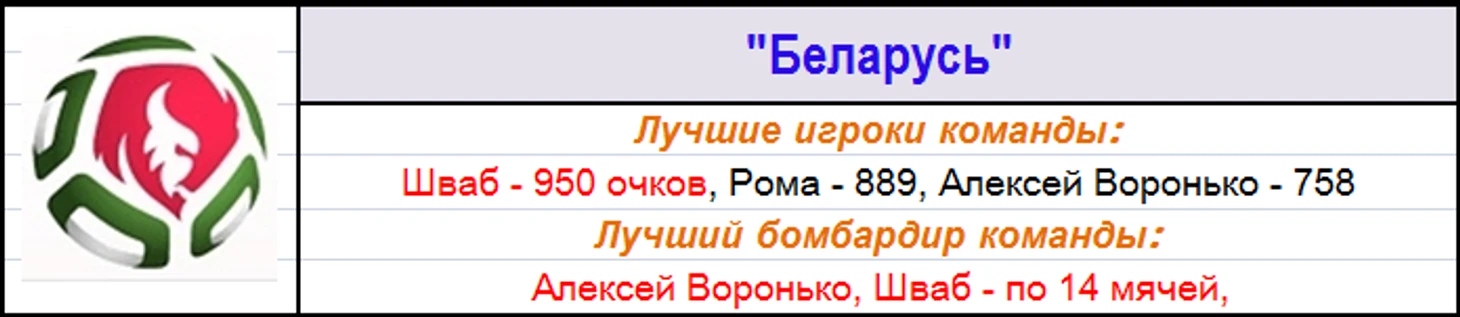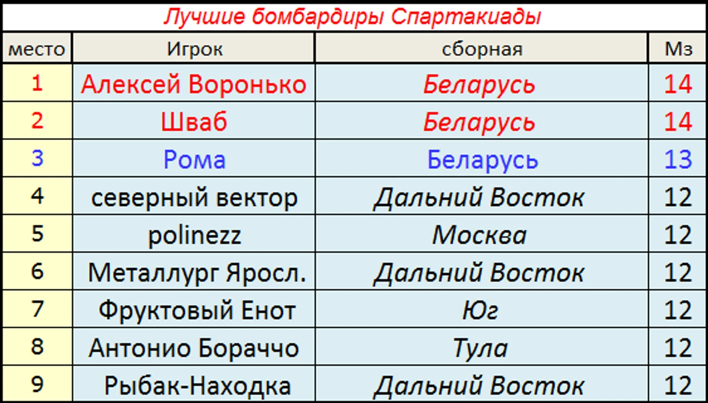 Первое место в номинации "Лучшим бомбардир" спартакиады " на данный момент с 14 забитыми мячами делят 2 игрока сборной "Беларусь" - Алексей Воронько и и Шваб.. правда, Алексею, для этого хватило 15 матчей в основе (!), а Юрий забил такое количество голов за все 19 туров... хочется отметить и то, что в тройке главных голеадоров турнира так же фэнтазист белорусской сборной - Рома... вот такие прирожденные бомбардиры в этом регионе рождаются))