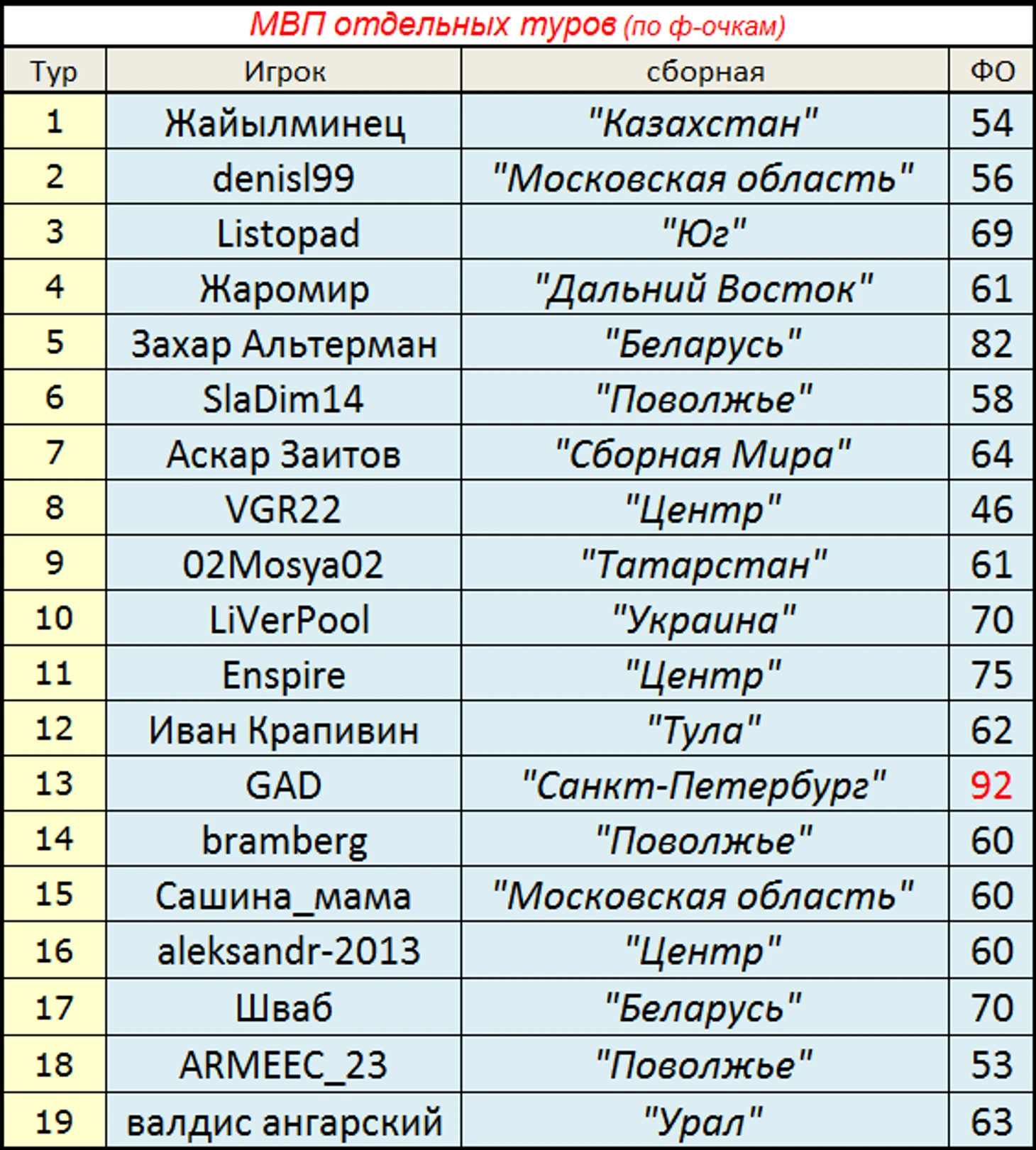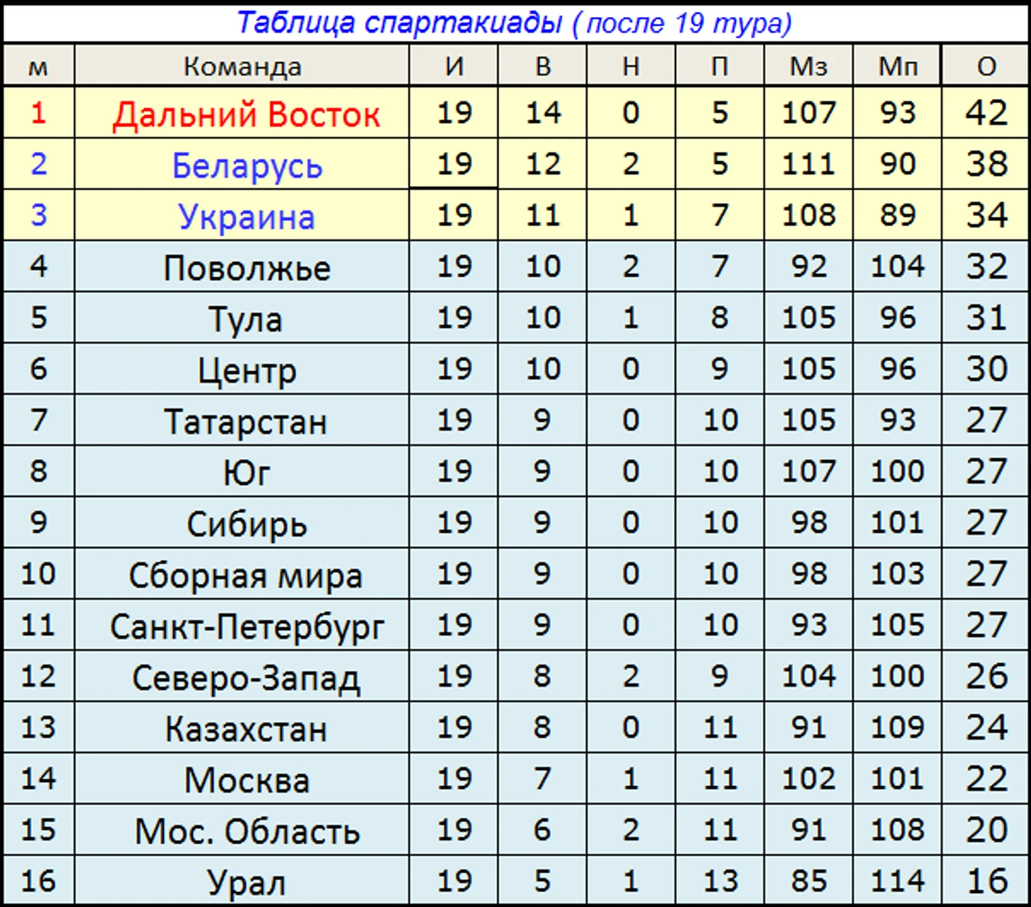 Как видим из турнирной таблицы, лидер Спартакиады РПЛ на данный момент - команда "Дальний Восток"... Это особенно сенсационно выглядит, если вспомнить итоги прошлого сезона - ДальВо закончил его в роли безнадежного аутсайдера на последнем месте и с 17 очками в итоге... Но, пришли новые игроки, сделаны выводы из неудач и сборная этого региона просто преобразилась - в первых 10 турах - 9 побед!!!... Далее уже менее стабильно побеждают, но этого хватило, что бы на этом промежуточном этапе финишировать первыми....
