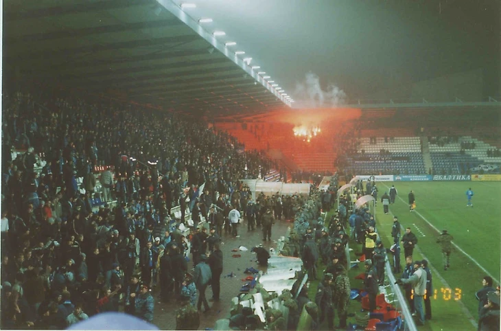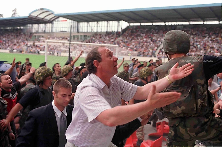 Фанаты сошлись в рукопашной около центральной трибуны. Махач на новеньком и уютном стадионе без беговых дорожек: красота, прям Англия 70-х или 80-х годов. Ту схватку видели все, кто наблюдал за матчем по телевизору – благо в те времена такие события не вырезали из эфира.