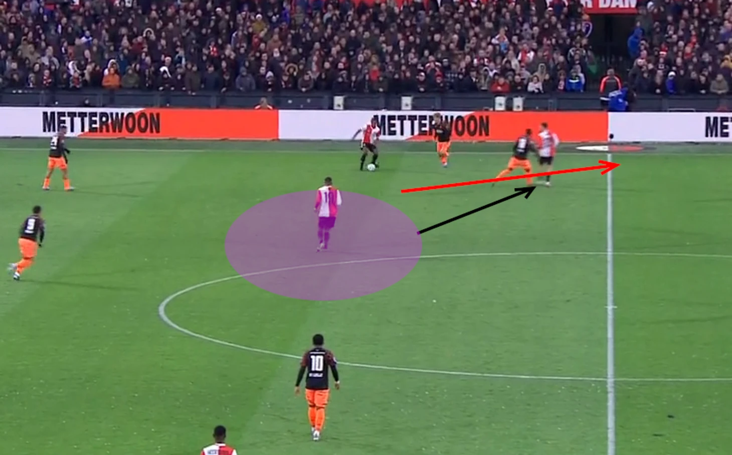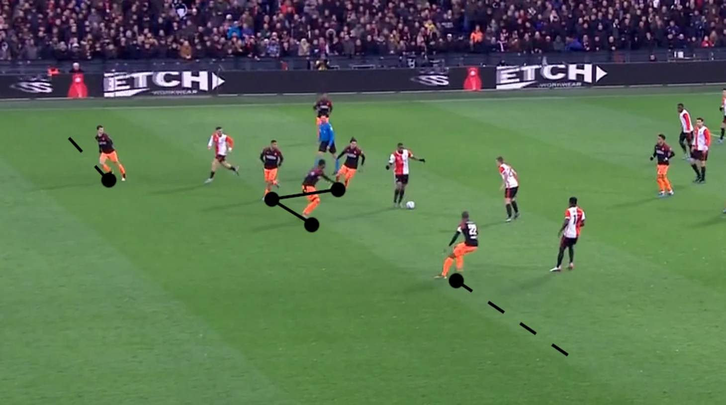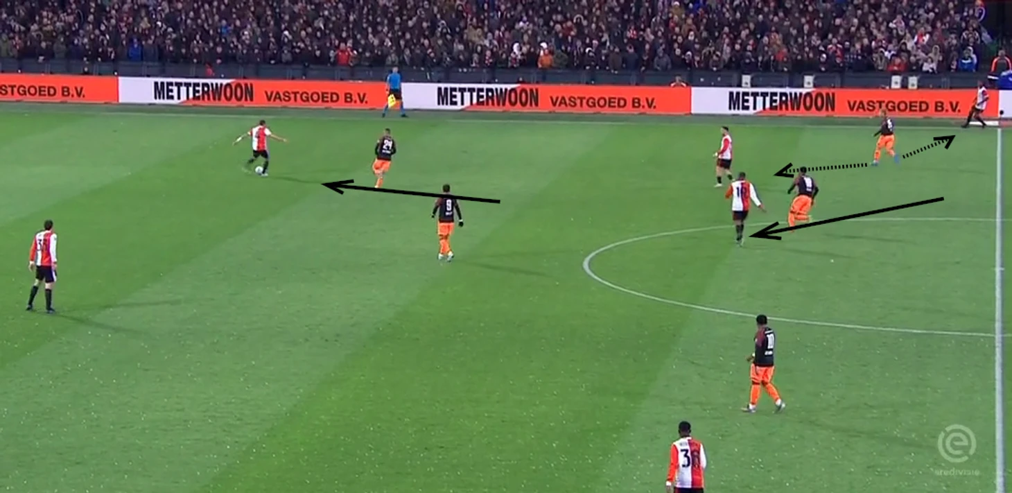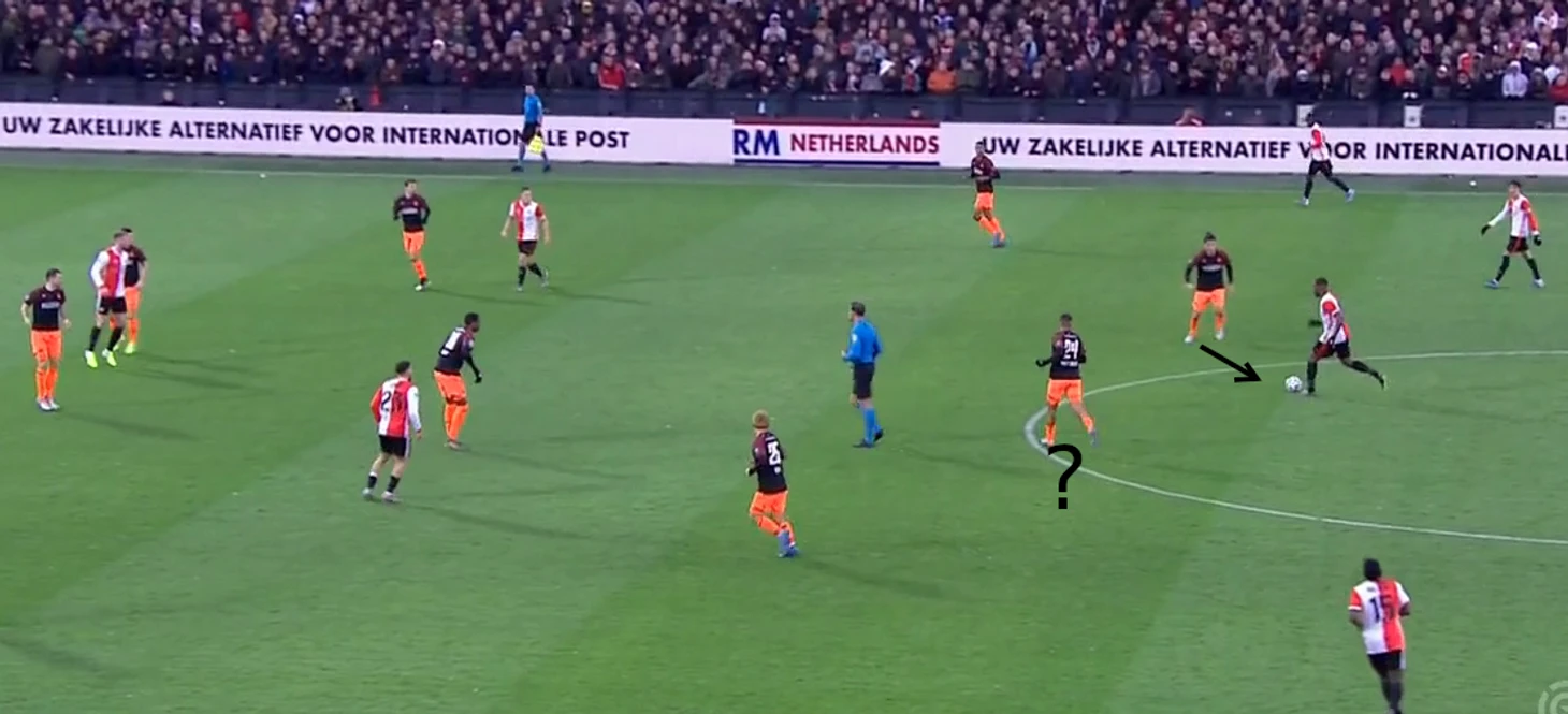 Вся эта структура легко разбивается передачей на фланг и одним нехитрым манёвром одного из полузащитников - Доан переключается на игрока с мячом, а Розарио реагирует на рывок соперника. Результат - опорник Фейеноорда имеет полную свободу в центре.