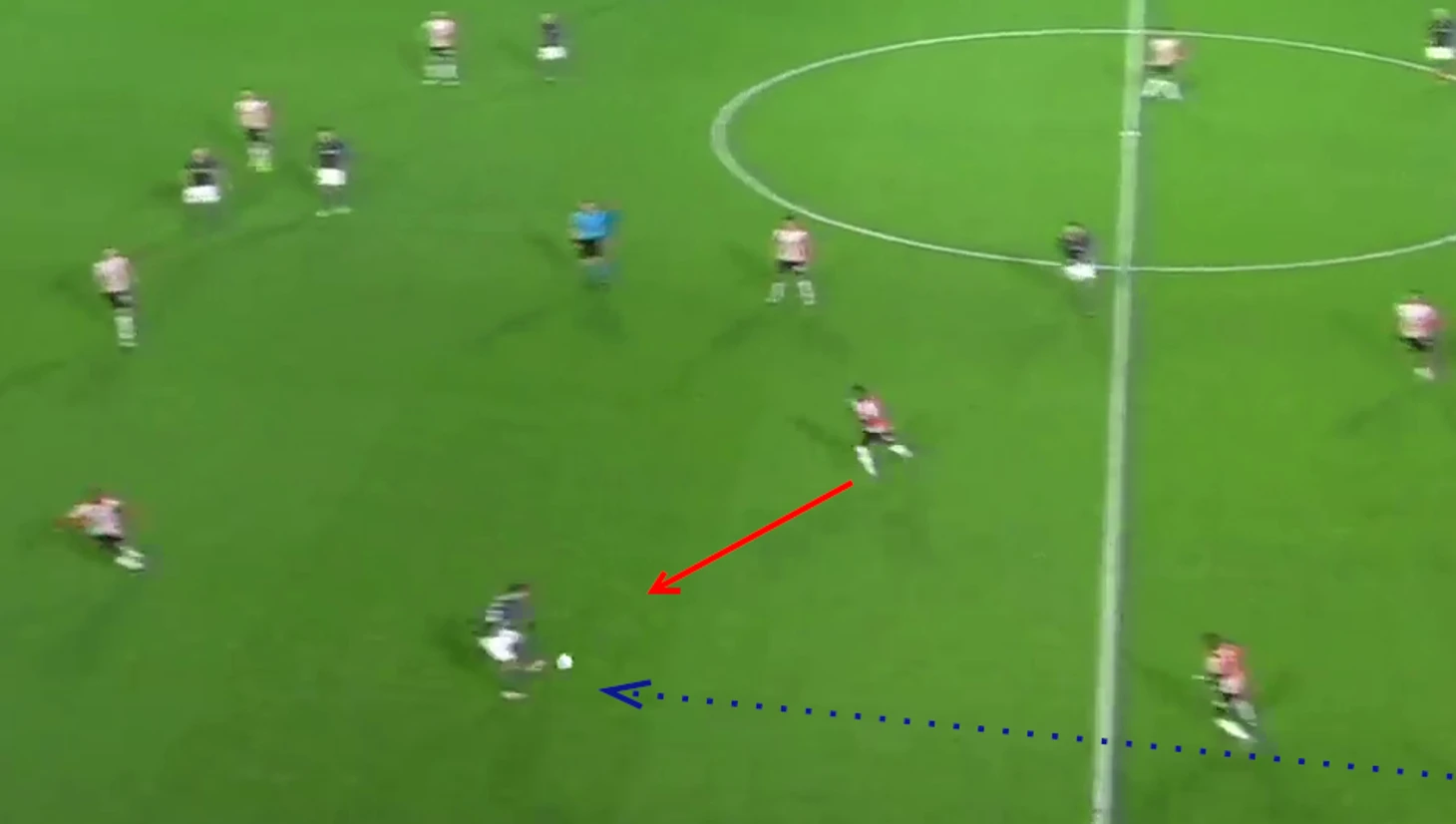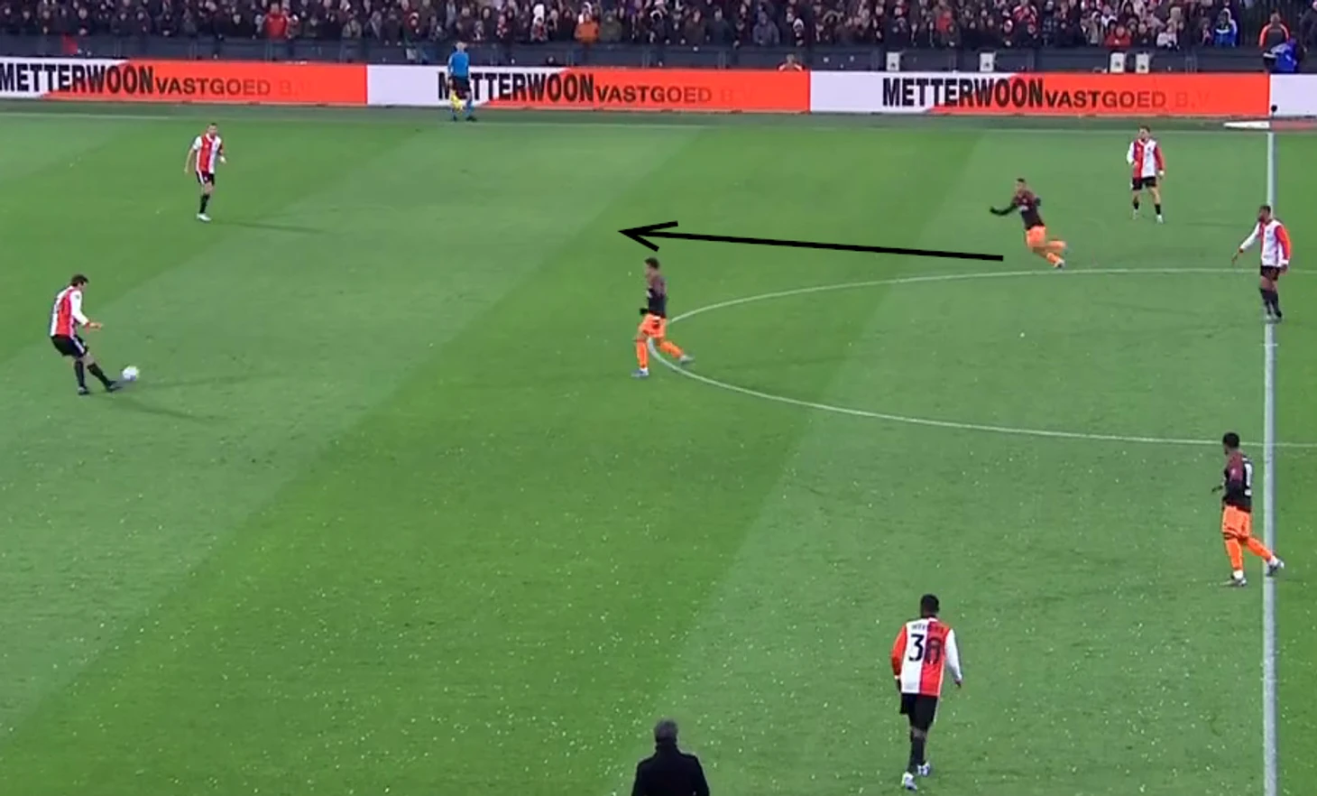 Это эпизод из матча Фейеноорд - ПСВ. Ихаттарен начинает прессинговать центрального защитника по принципу “я к нему ближе всех”. Против двух центральных полузащитников Фейеннорда играют полузащитник Розарио и правый вингер Доан (по тому же принципу).