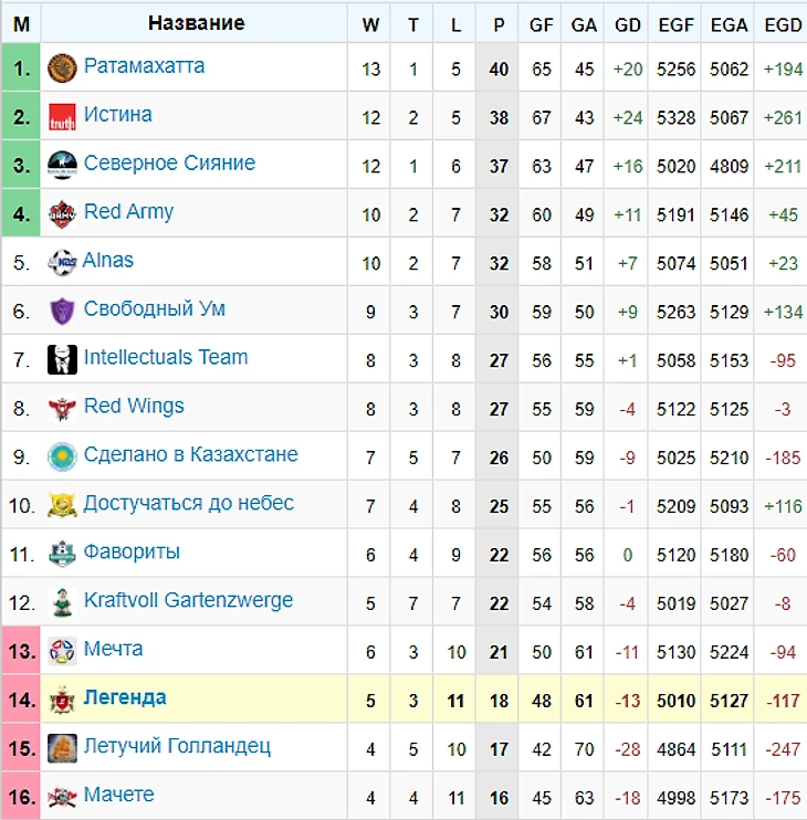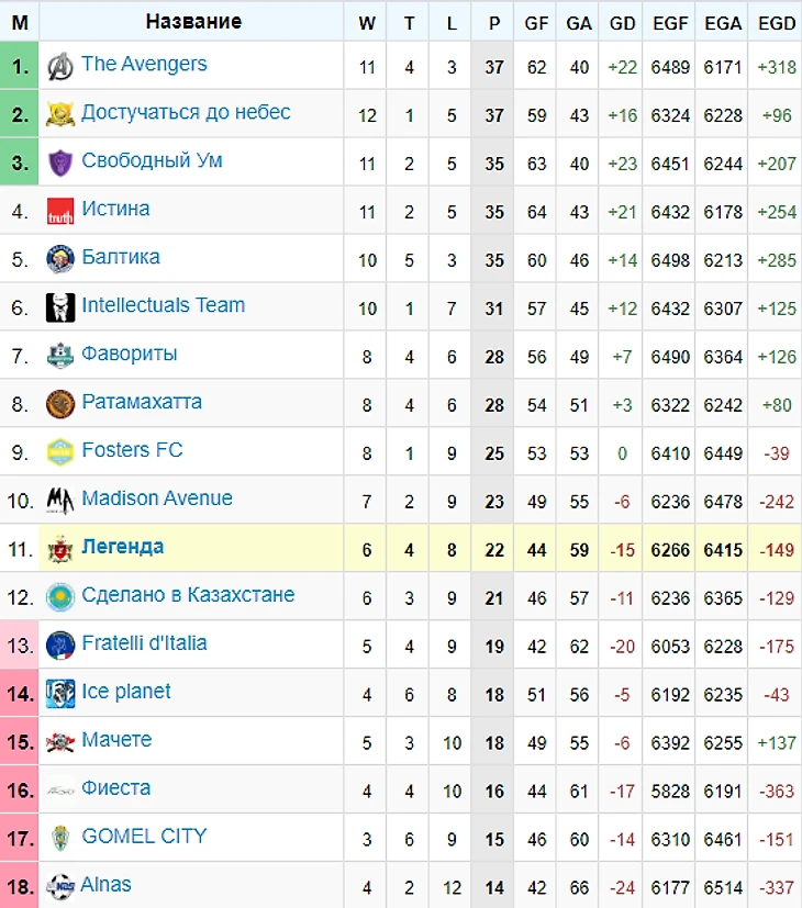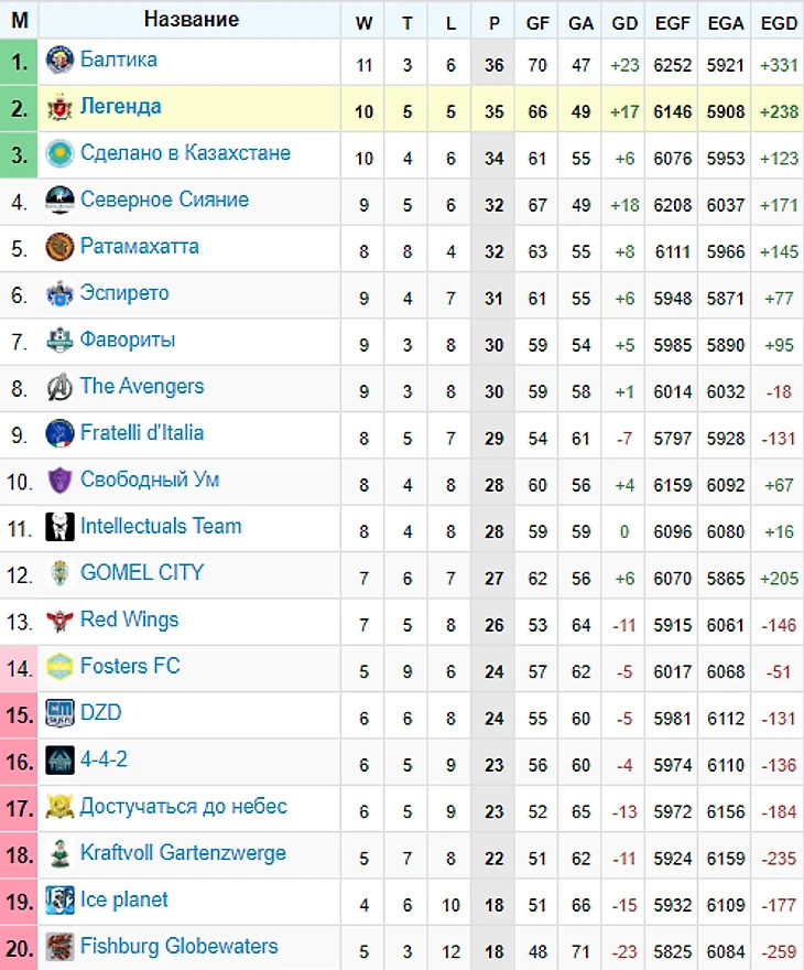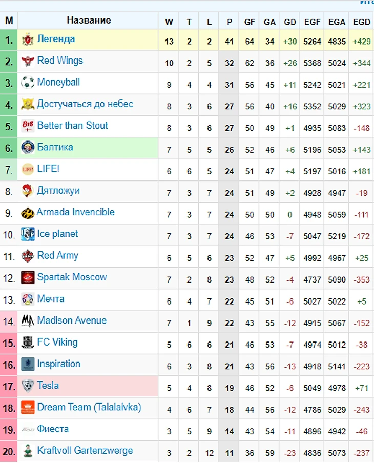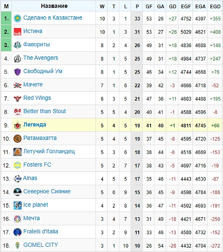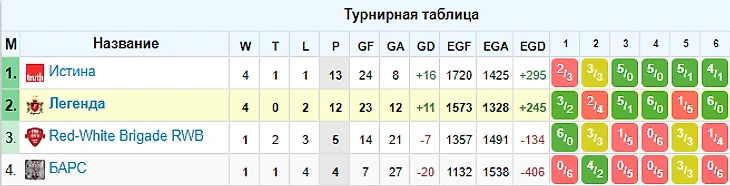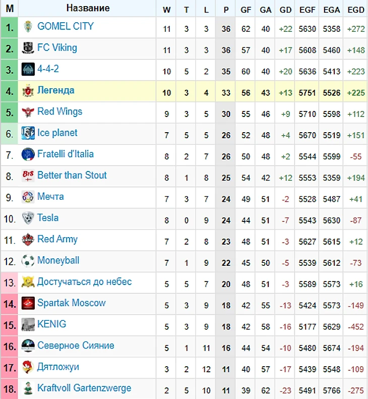 Пока самый удачный для нас турнир этого года в высшем дивизионе! Хорошо спуртанули в последних 9-ти турах и сумели взобраться на 2 место. Из соседей по турнирной таблице проиграли только Северному Сиянию, впереди - важнейшие игры с "казахами" и "мстителями", которые станут проверкой наших амбиций на высокие места в этом турнире. Dimon0910 с 13 мячами - в топ-5 лучших бомбардиров турнира.