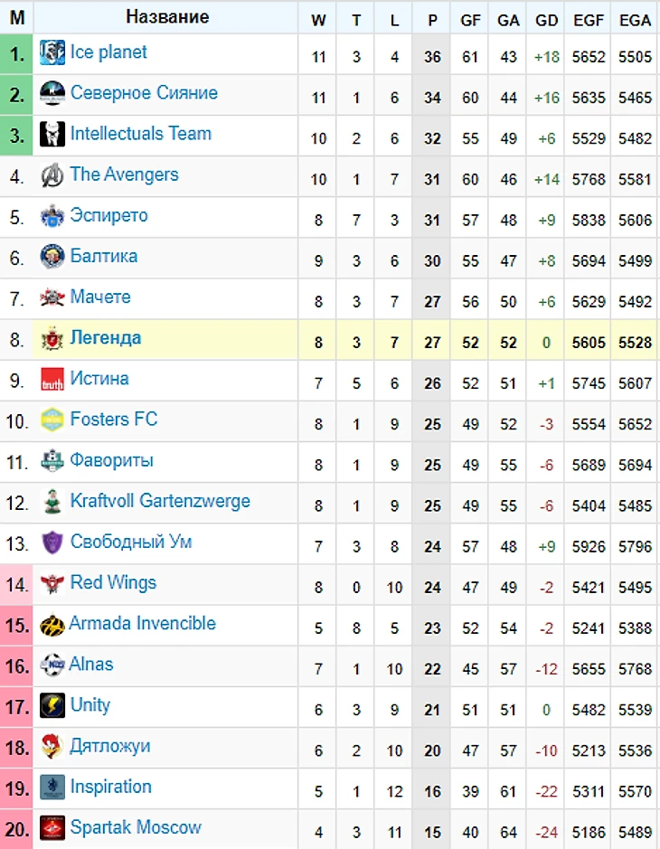 Францию начали очень хорошо и одно время шли в топ-3, но потом попали в небольшой кризис и несколько уступили свои позиции, проиграв 3 игры подряд. На перерыв ушли в приподнятом настроении, разгромив соседей по турнирной таблицу из Red Army. Еще нельзя не отметить победу над Истиной в 4 туре, все остальные обыгранные соперники обитают ниже нас. Впереди много игр с непосредственными конкурентами, так что после нового года будет жарко.