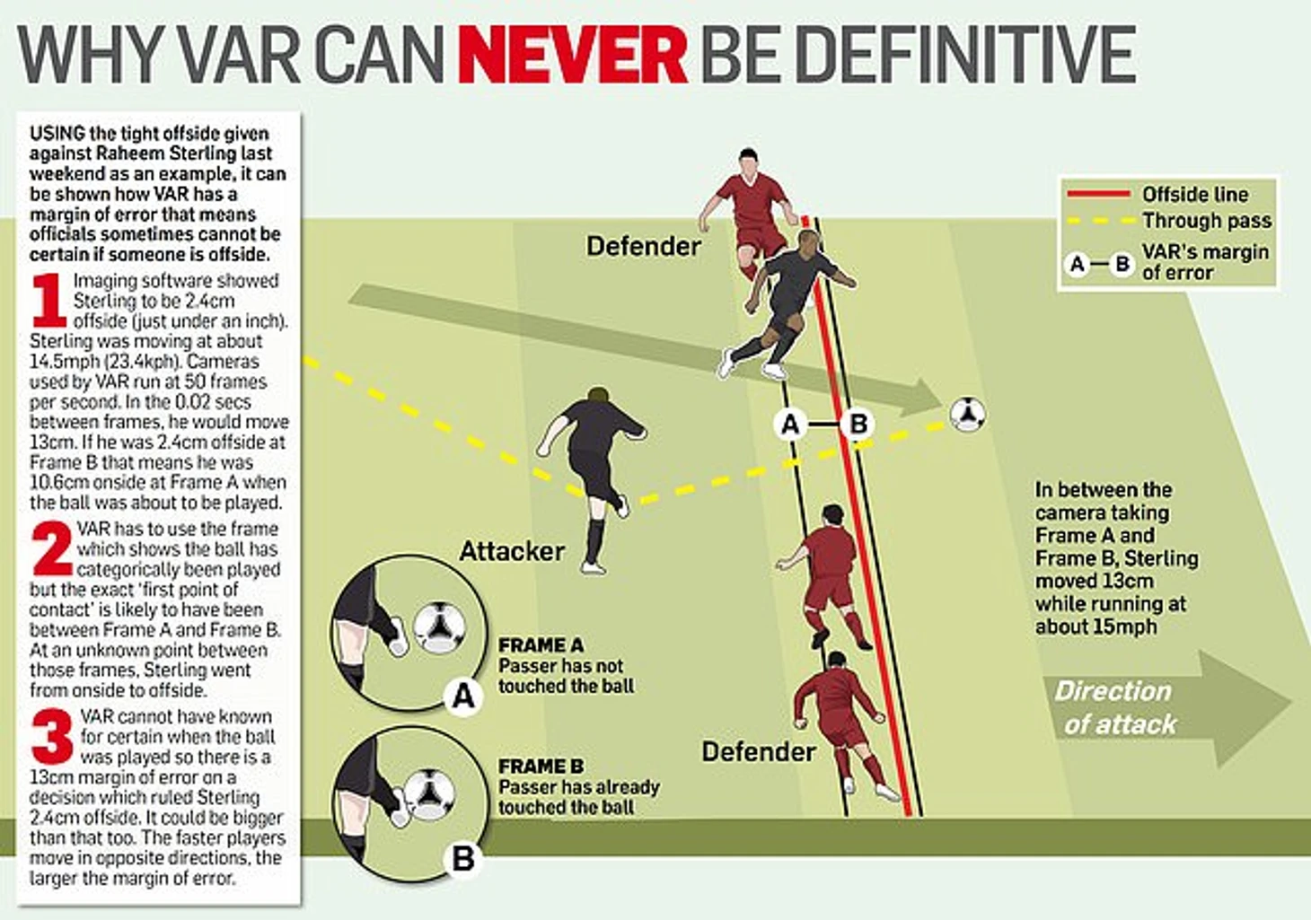 • При такой скорости записи 13 см разброса в беге Стерлинга превращаются в 1,9 см. ВАР зафиксировал офсайд 2,4 см, так что Рахим попал в зазор.