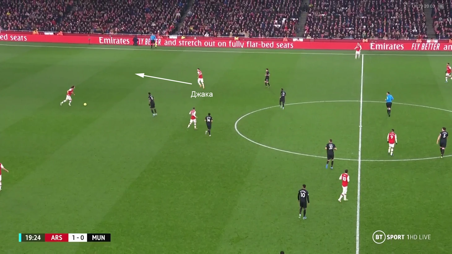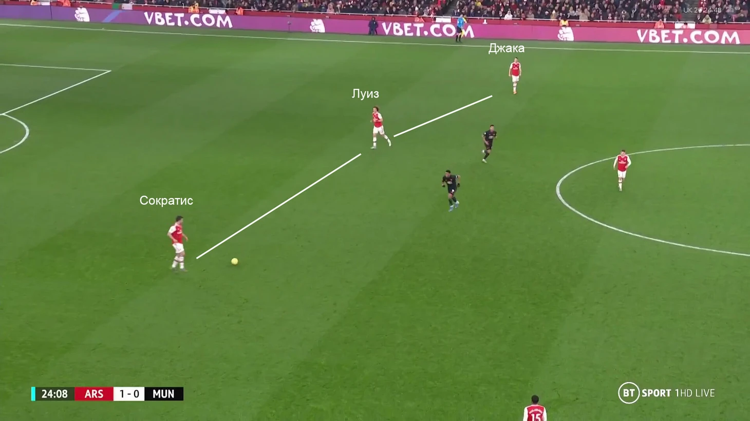 «Арсенал» был к этому готов, поэтому в линию к защитникам постоянно опускался Гранит Джака. Более того, он всегда выбирал зону левого защитника, чтобы иметь максимальный диапазон для передач, если его оставят свободным:
