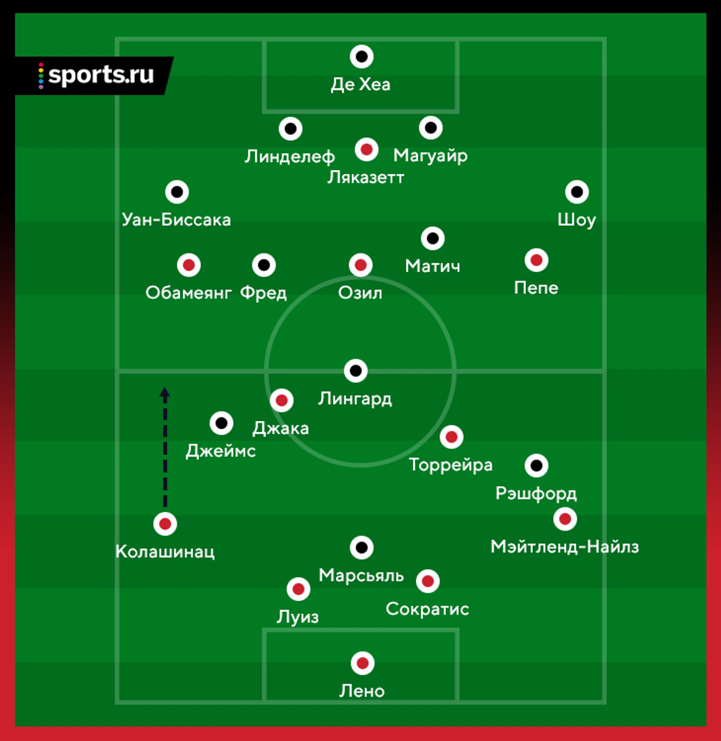 По традиции центр был закрыт. «Арсенал» просто обходил эту зону. Когда заглядывали туда, Фред в агрессивной манере отбирал мячи (3 отбора, 2 перехвата) и делал качественные вертикальные пасы после отборов. Матич оборонялся за счет чтения игры и тоже был хорош. Во втором тайме серб даже попытался дать команде атакующих качеств (это требовалось, учитывая счет) – его усилий хватило, чтобы выделиться на фоне остальных, но не хватило для результата.