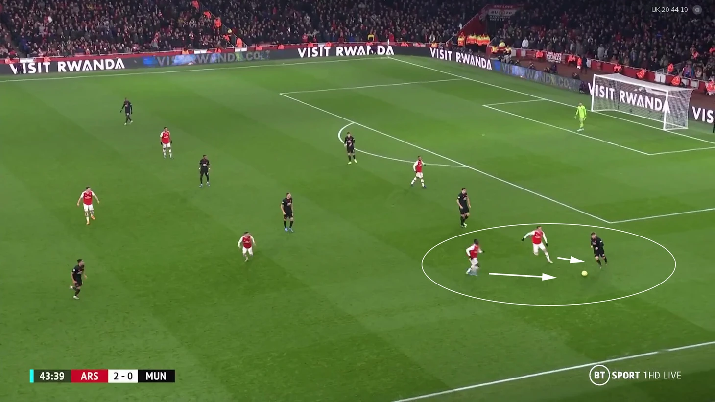 Артета сразу отреагировал – у «Арсенала» вместо Александра Ляказетта вышел Маттео Гендузи. Команда перестроилась на 4-3-3 с 3 опорниками. Левый фланг поочередно прикрывали Озил и Обамеянг.