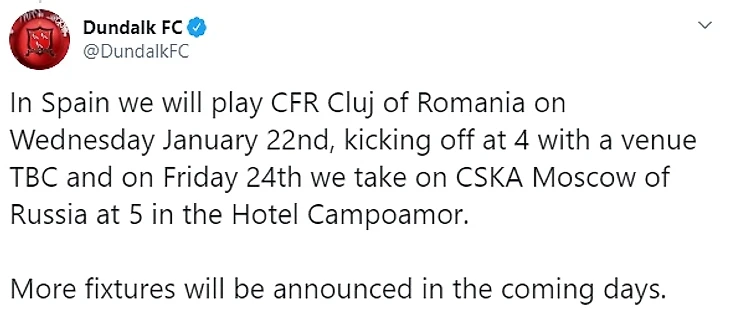 Об этом сообщила пресс-служба ирландского клуба. Матч состоится 24 января в испанском Кампоаморе. Прежде армейцам не приходилось играть против этого клуба. «Дандолк» является действующим чемпионом Ирландии.