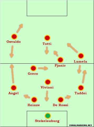 Эту роль исполняет Де Росси, играя глубоко, опускаясь между двумя центральными защитниками и позволяя им расходиться ближе к флангам. Как правило, он играл лучше остальных одноклубников, и, похоже, чувствует себя главным элементом команды.