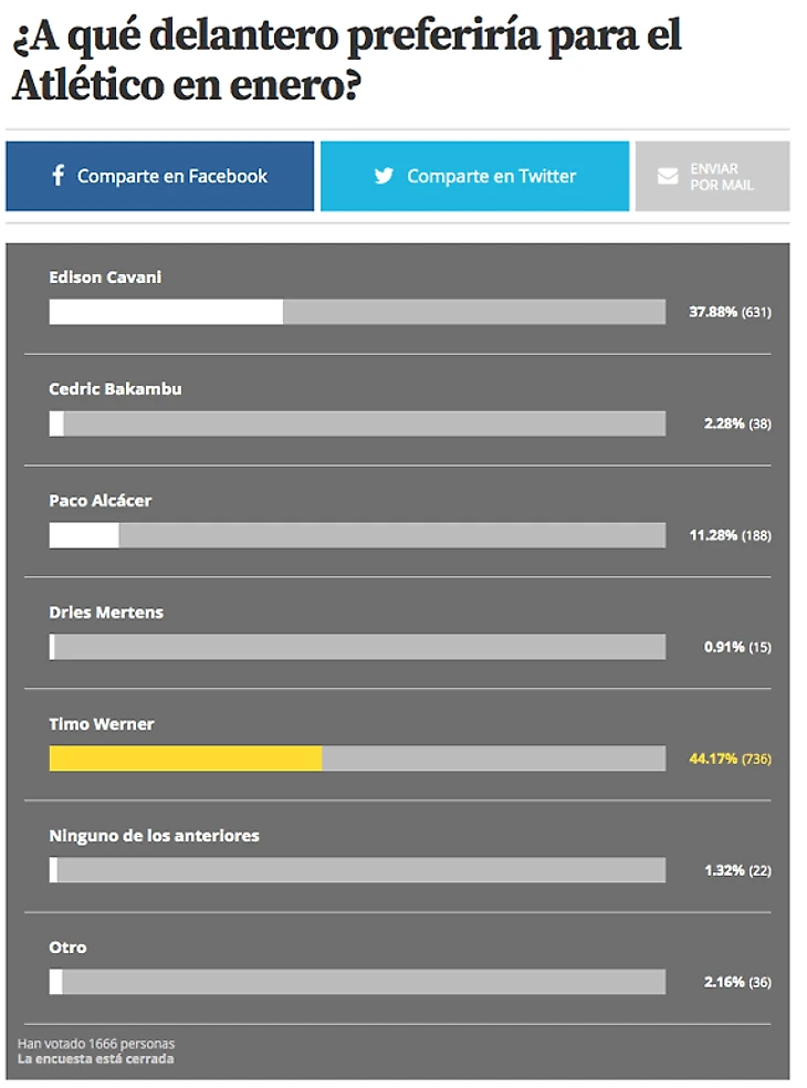 В голосовании приняло участие 5 кандидатов, чьи имена связывали с переходом в стан «Матрасников» в зимнее трансферное окно. Парадоксально, но Эдинсон Кавани не является фаворитом для фанатов. Поклонники «Рохибланкос» отдали предпочтение Тимо Вернеру. Немец получил самое большое количество голосов - 44,1%. Кавани же поддержало 37,8% голосов. Замыкает тройку лидеров Пако Алькасер со скромными 11,2% голосов публики