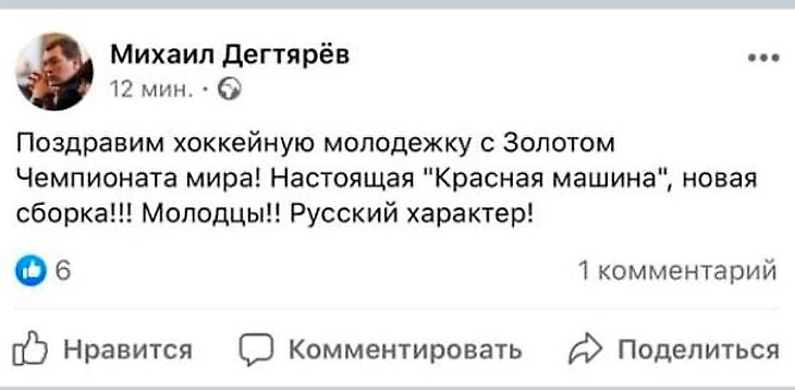 Если футболист Дмитрий Тарасов оперативно оправдался проигрышем в игру, за который должен был написать поздравление с победой, то председатель комитета Госдумы по физкультуре, спорту, туризму и делам молодежи Михаил Дегтярёв просто удалил патриотичный пост, написанный после просмотра трансляции на «Матче».