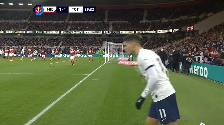 На 7-й минуте бегущая строка, которая разделяет ярусы стадиона, показала надпись #ReleaseTheSnyderCut и ссылку на твиттер @RTSnyderCut.