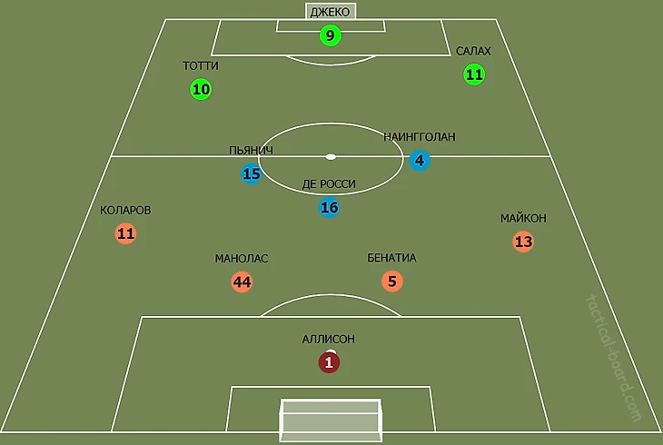 В резерве: Щесный, Фасио, Рюдигер, Строотман, Пеллегрини, Эль-Шаарави, Вучинич.