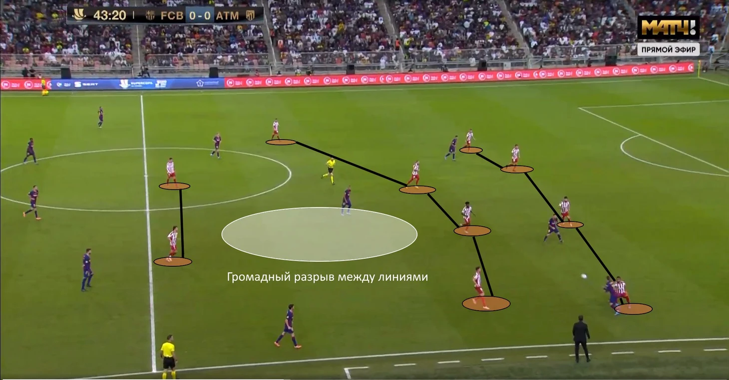 Мадридцы же играли в аналогичные 4-4-2, но на постоянной основе. Вот например, когда команда Симеоне без мяча выстроилась в выше названную формацию, но оставила большое пространство Видалю в центре, что позволило выйти Каталонцам из под прессинга, и начать вполне осмысленную атаку: