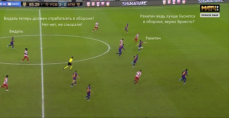 Теперь, на мой взгляд, начинается мастер-класс от Вальверде по сливу футбольных матчей. Он меняет Бускетса на Ракитича, при этом, Видалю не дана инструкция опуститься ниже, в опорную зону.