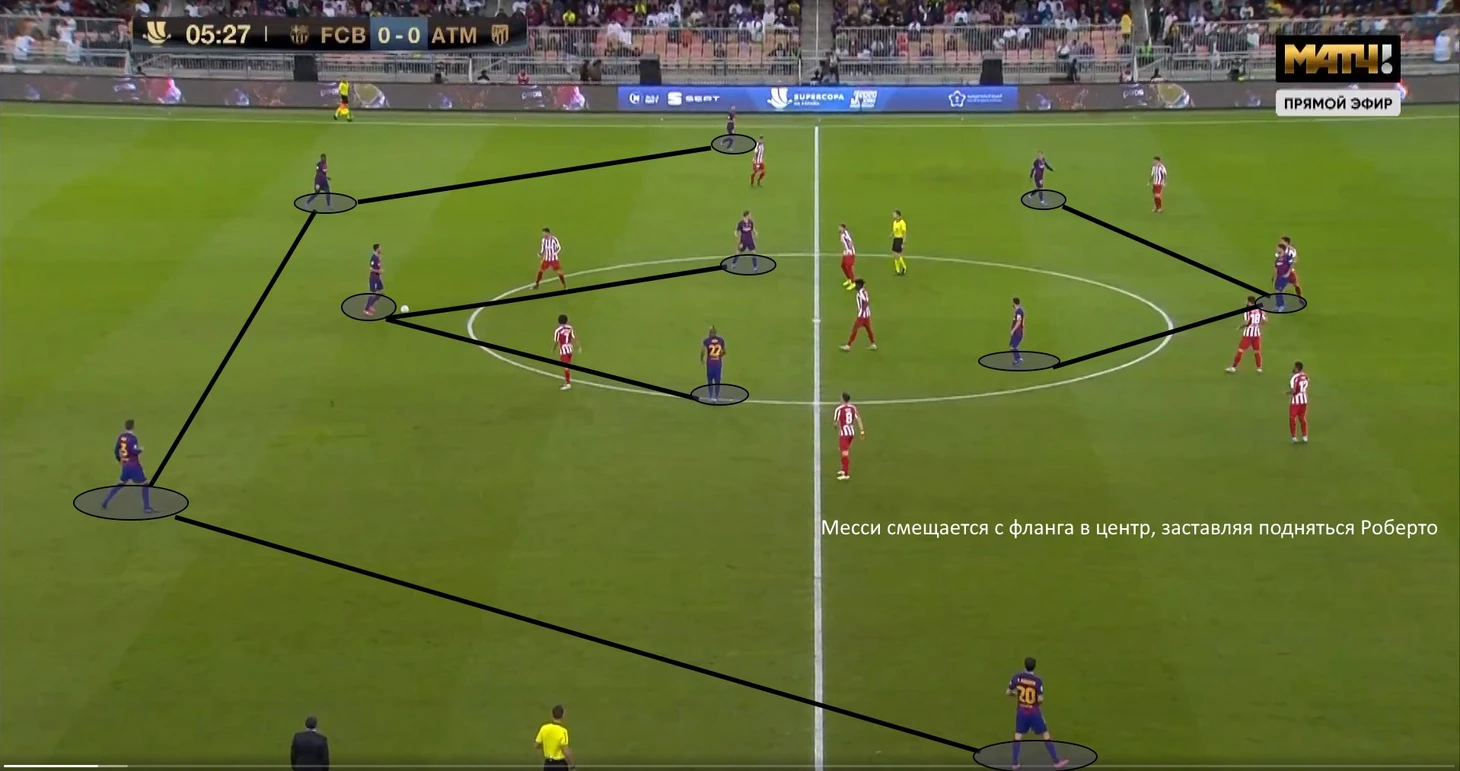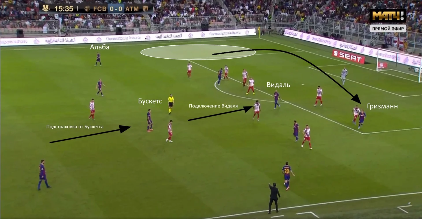 Итак, что мы видим? Гризманн умышленно смещается на правый фланг, занимая позицию по-сути правого вингера. Видаль также подключается к атакующим действиям команды, становясь де-факто центр-форвардом, что вынуждает гораздо выше подниматься Бускетса, дабы заполнить пустоту оставленную Чилийцем. Подобные действия приводят к тому, что левый фланг теперь полностью открыт для Альбы, про которого оборона Атлетико в этом матче почему-то забыла.
