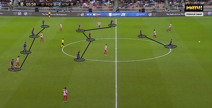 3. Теперь рассмотрим некоторые моменты более детально. Начнём с эпизода середины 1 тайма, когда Барселона откровенно перегружала правый фланг Атлетико. Результатом данных действий, стала полная перетасовка группы Каталонской атаки. Рассмотрим это все при помощи скриншота приведённого ниже: