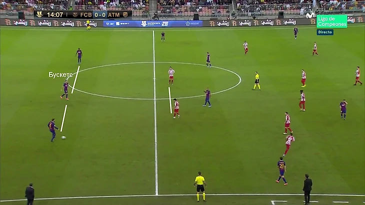 5. Ключевое отличие от матча чемпионата – Серджи Бускетс в составе «Барселоны». Он быстро успокоил прессинг «Атлетико». Для этого опорник «Барсы» использовал простой прием с опусканием в линию к центральным защитникам – это создавало 3-в-2 в первой стадии и затрудняло сопернику прессинг: