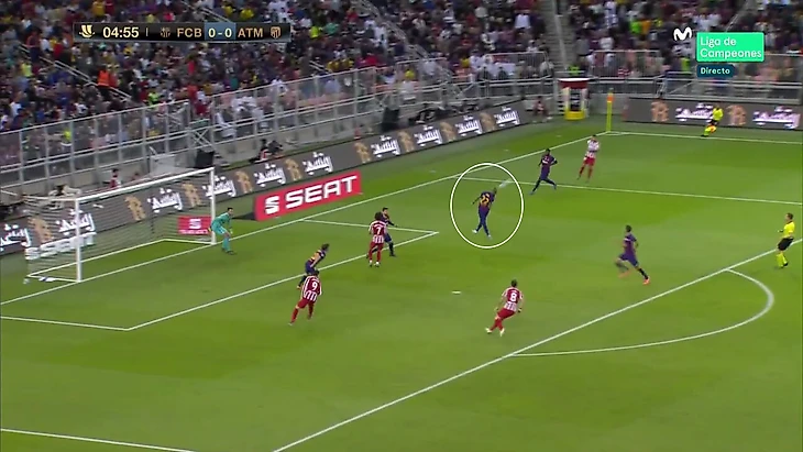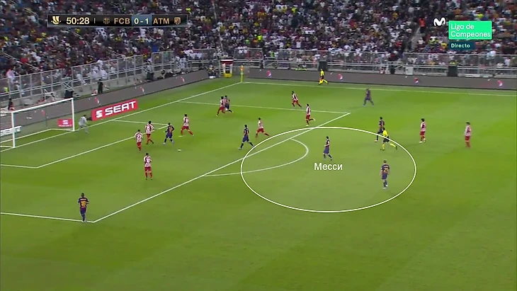 Пример был в эпизоде с первым голом. «Атлетико» создает интенсивность в зоне мяча, а Месси достаточно далек от эпизода, чтобы получать свободу (часто он умышленно искал эту свободу, даже если какое-то время не участвовал в моменте):