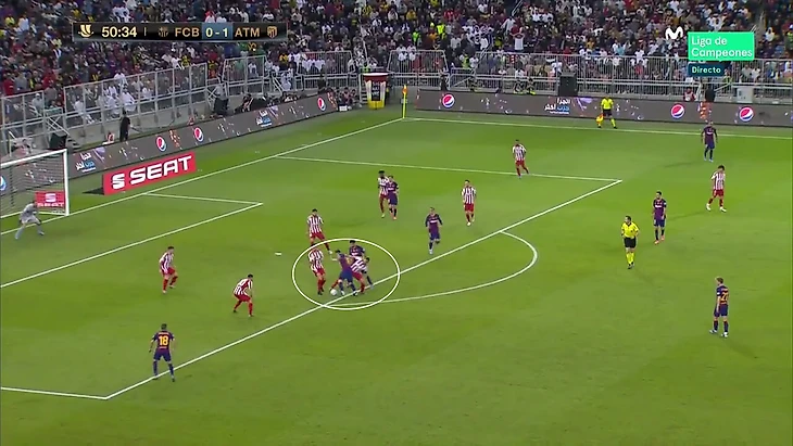 Такое соотношение было возможным, потому что полузащита «Барсы» не адаптировалась и застревала в прессинге, хотя «Атлетико» больше не пытался проходить прессинг, а играл через него (прямолинейными пасами на Морату):