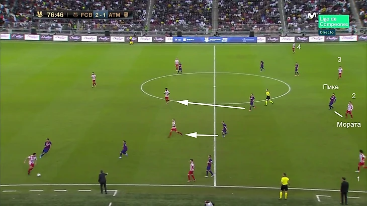 Главный парадокс – у Мораты действительно получалось разворачиваться. Отчасти это вина Пике, который действовал недостаточно плотно. Но нельзя забывать, что защита «Барсы» по сути оставалась 4-в-4 против соперников – это максимально невыгодное для обороняющейся стороны соотношение, в котором обычные принципы защиты не работают.