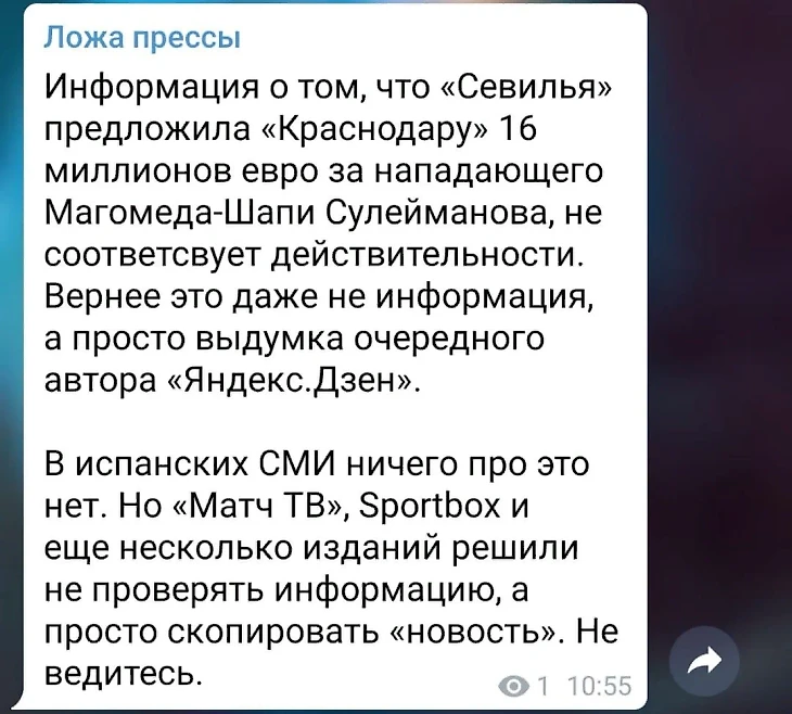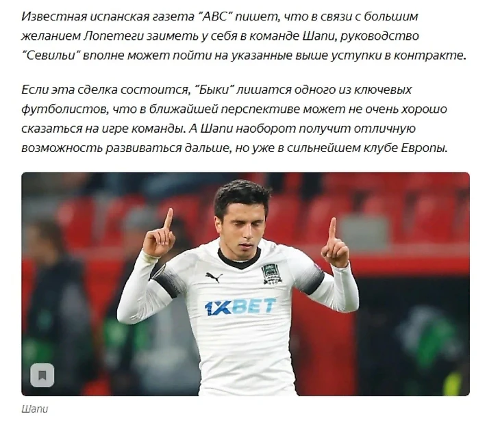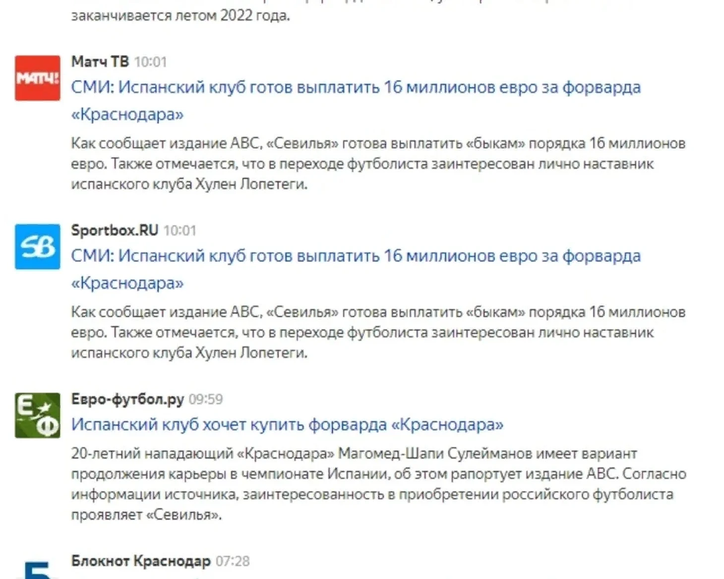 Итак, что произошло-то вообще? Вчера в сети появилась информация о том, что Сулейманов якобы заинтересовал "Севилью", а испанский клуб уже предложил "Краснодару" 16 млн евро. Ключевое слово здесь - "якобы". На самом деле, эту информацию достаточно влиятельные источники просто скопировали у одного автора с платформы Яндекс.Дзен! Как такое произошло - непонятно, почему они не проверили достоверность - непонятно.