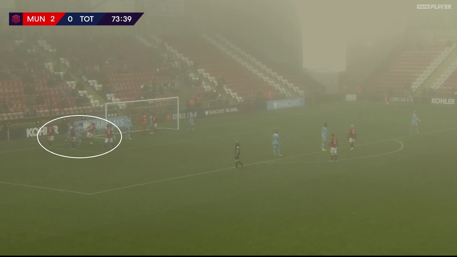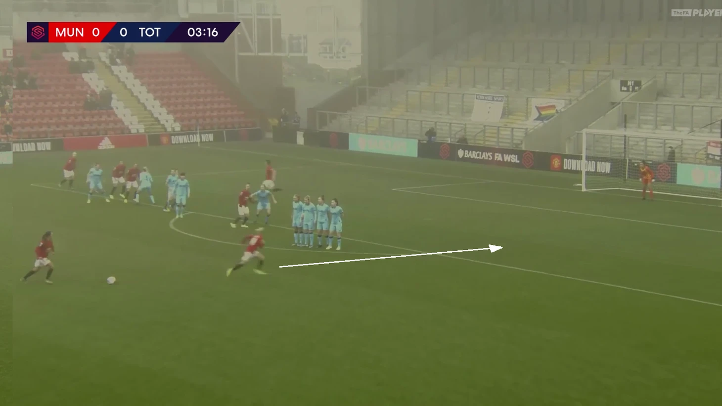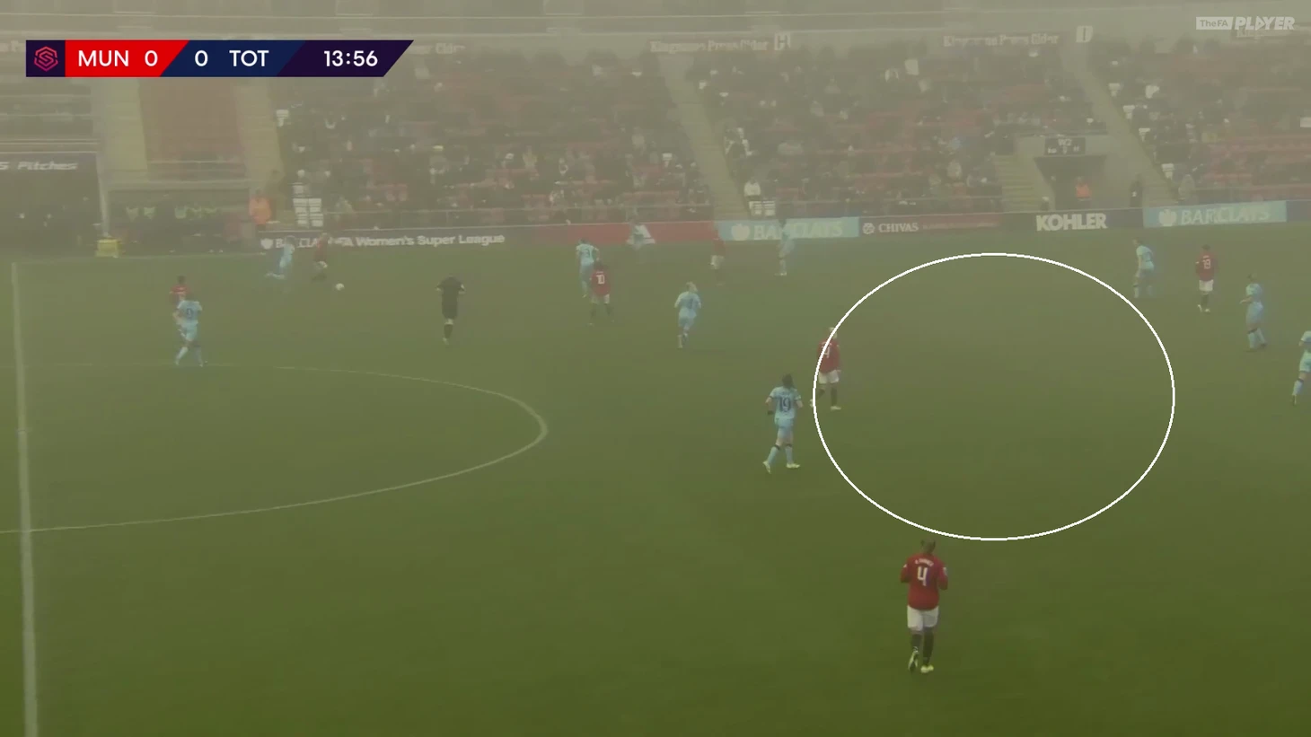 "Ман Юнайтед" традиционно начал очень активно, забрал мяч, контролировал игру, создавал моменты. "Тоттенхэм" кое-как пытался отбиваться. МЮ очень активно использовал атаки по левому флангу, где играла Лия Галтон. Она отлично контролирует мяч на скорости и не теряется под давлением, плюс отдаёт обостряющие передачи. "Шпоры" в позиционной обороне часто ошибались, оставляли большие расстояния между линиями обороны и полузащиты: