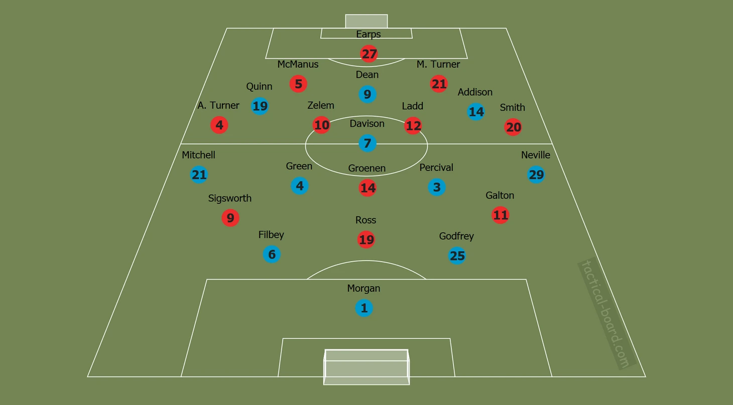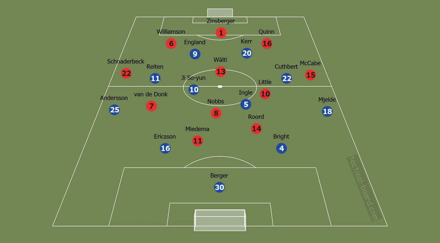 В перерыве Ник Кушинг сделал довольно неожиданную замену. Вместо Джанин Бекки, которая провела отличный первый тайм, появилась Джорджия Стануэй. Причём это была замена по позиции, то есть номинальная нападающая вышла на левый фланг обороны. Обычно Стануэй действует либо как форвард, либо в дуэте нападающих, играя в оттяжке. Изредка Кушинг использовал её на фланге атаки.