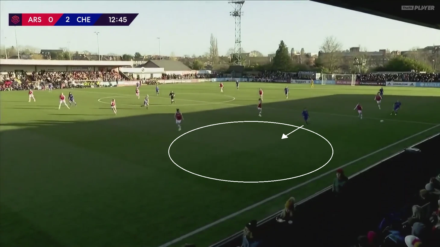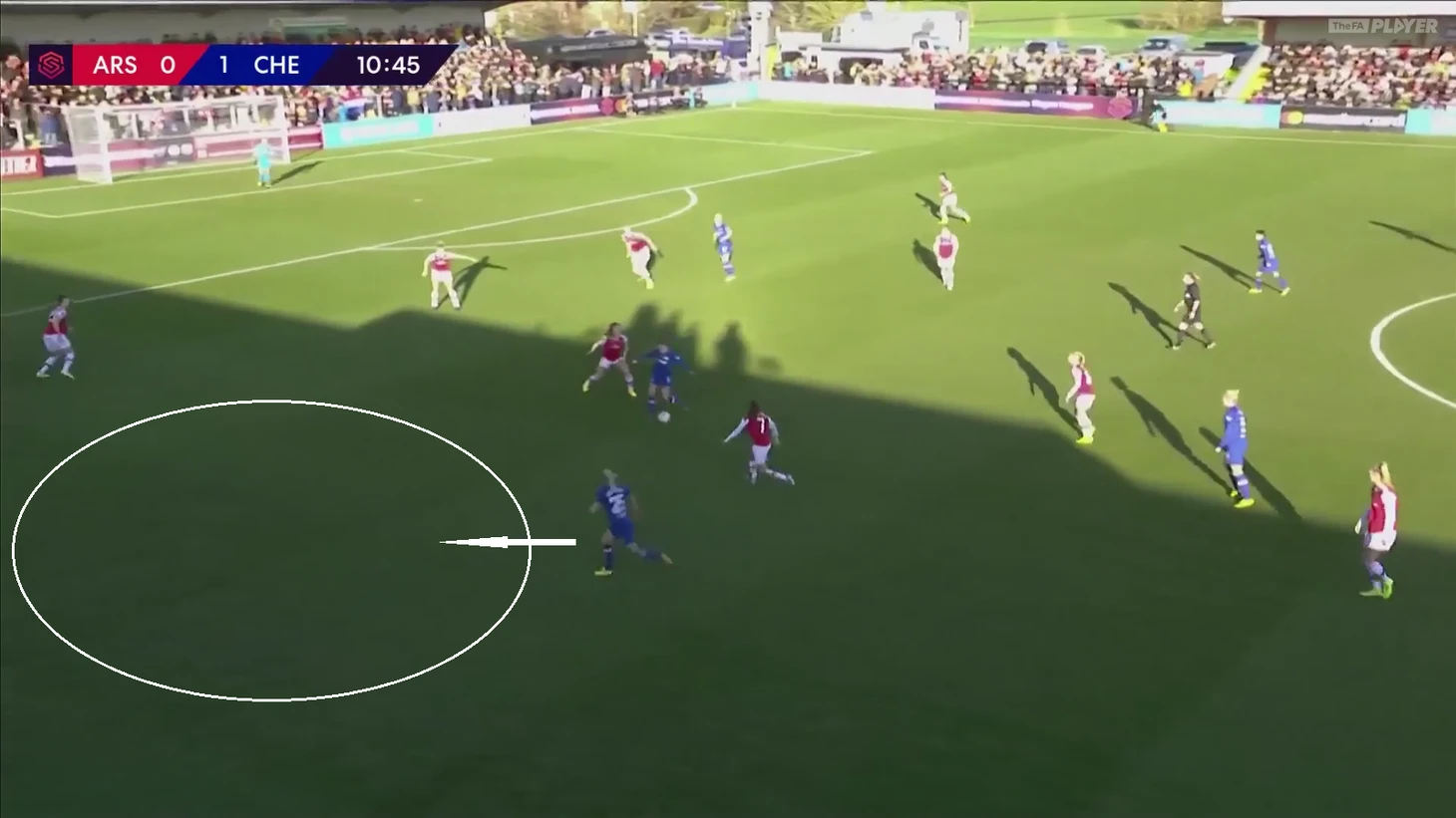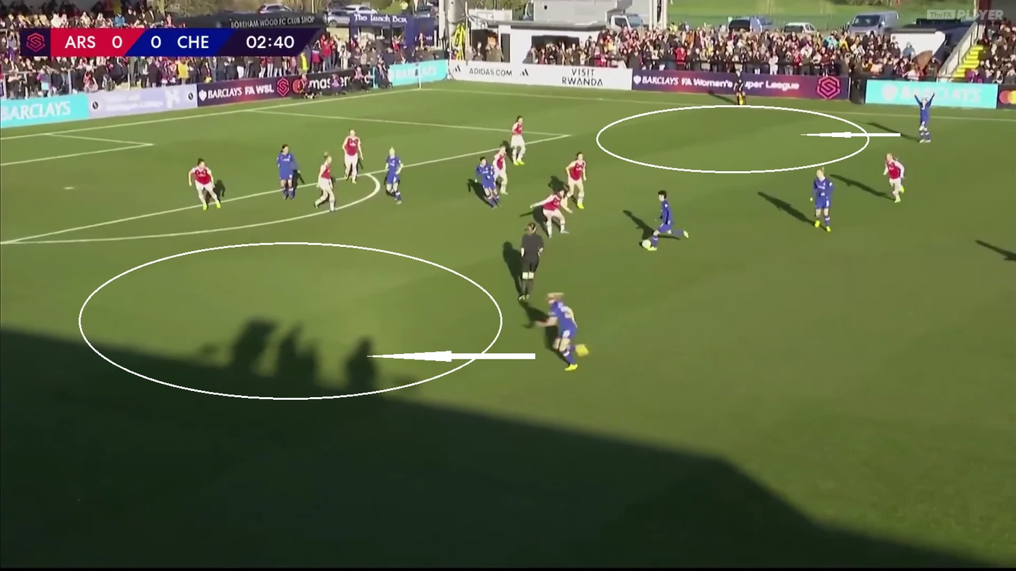 "Челси" не стеснялся играть навесами с самого начала, тем более имея в атаке пару Ингленд–Керр. Обе хорошо балансируют на линии офсайда и открываются под забросы. Обычно "синие" использовали левый фланг для подобного рода атак. Там как раз в непривычной для себя позиции играла Шнадербек.