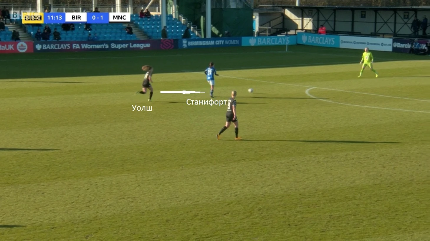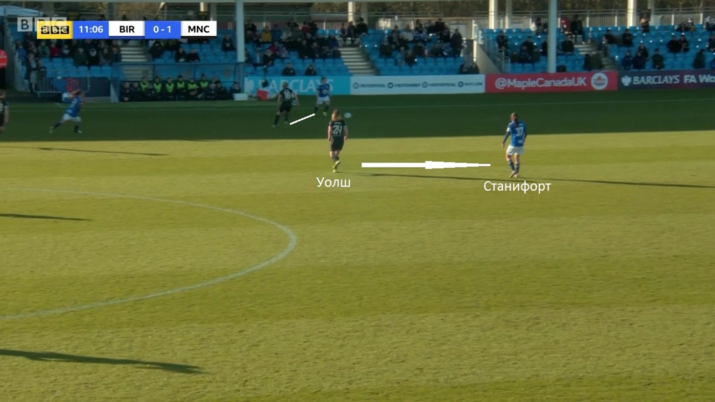 А если в ту же зону опускалась Хлое Артур, то дополнительно для прессинга никто из игроков "Сити" не выдвигался. Это можно объяснить тем, что Станифорт более уверенно действует с мячом, от неё исходит бо́льшая опасность.