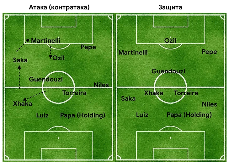 - Лаказетт и Нкетиа на позиции форварда при наличии Мартинелли, который вполне органично и эффективно смотрелся на этой позиции в ЛЕ и КЛ.