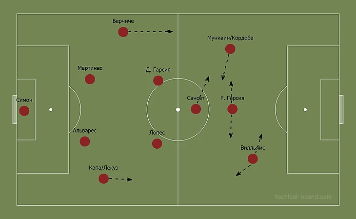 Левый фланг – наиболее интересная зона для анализа этой команды. На этом участке поля происходят очень интересные перемещения, комбинации и действия. Очень интересно, что нету конкретных игроков, на которых построена комбинация/продвижение мяча вперед. Например, в «Наполи» эпохи Сарри выделялся треугольник из Гуляма, Гамшика и Инсинье. В Басконии только один такой важный игрок – Берчиче (ЛЗ). Ширину выше может давать как Муниаин (также Кордоба, но он запасной), так и номинально атакующий полузащитник Сансет (или те же центральные полузащитники, точнее только левый центральный). Позицию в центре занимает один из ЦП или же опускается нападающий, который в большинстве эпизодов ищет варианты в полуфланге.