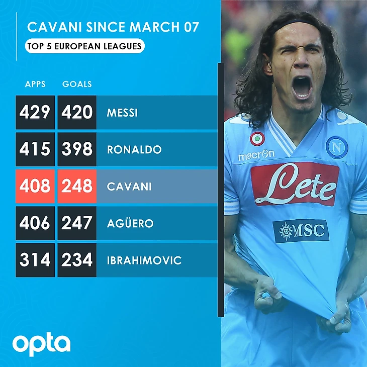 С тех пор, как Эдинсон Кавани дебютировал в Палермо, в марте 2007 года, только Лионель Месси и Криштиану Роналду, забили больше голов чем уругвайский нападающий