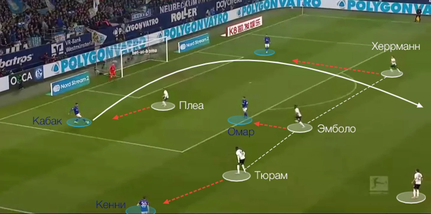 Два центральных нападающих работали по центральным защитникам. Шоф действовал между двумя опорниками «Боруссии». Сердар и Калиджури включались по флангам, если мяч направлялся на крайних защитников. Омар действовал по Плеа/Эмболо в зависимости от того, кто из них опускался на позицию «десятки».