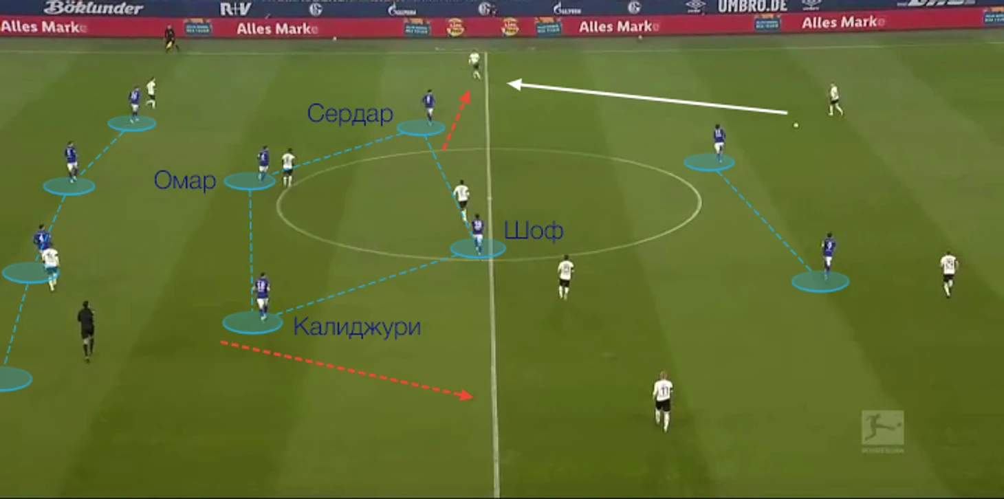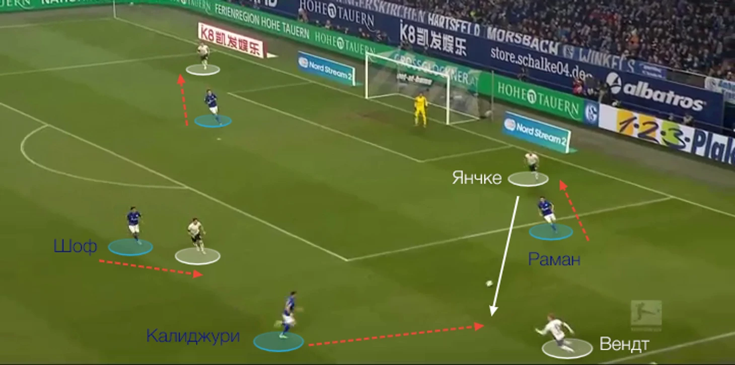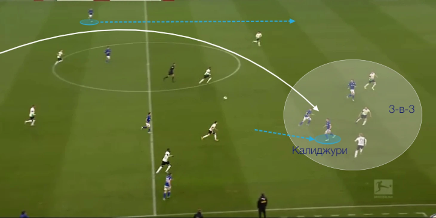 Главная ставка «Шальке» в таких ситуациях - длинный пас через правый полуфланг и смещение Калиджури в линию к нападающим для создания ситуации 3-в-3: