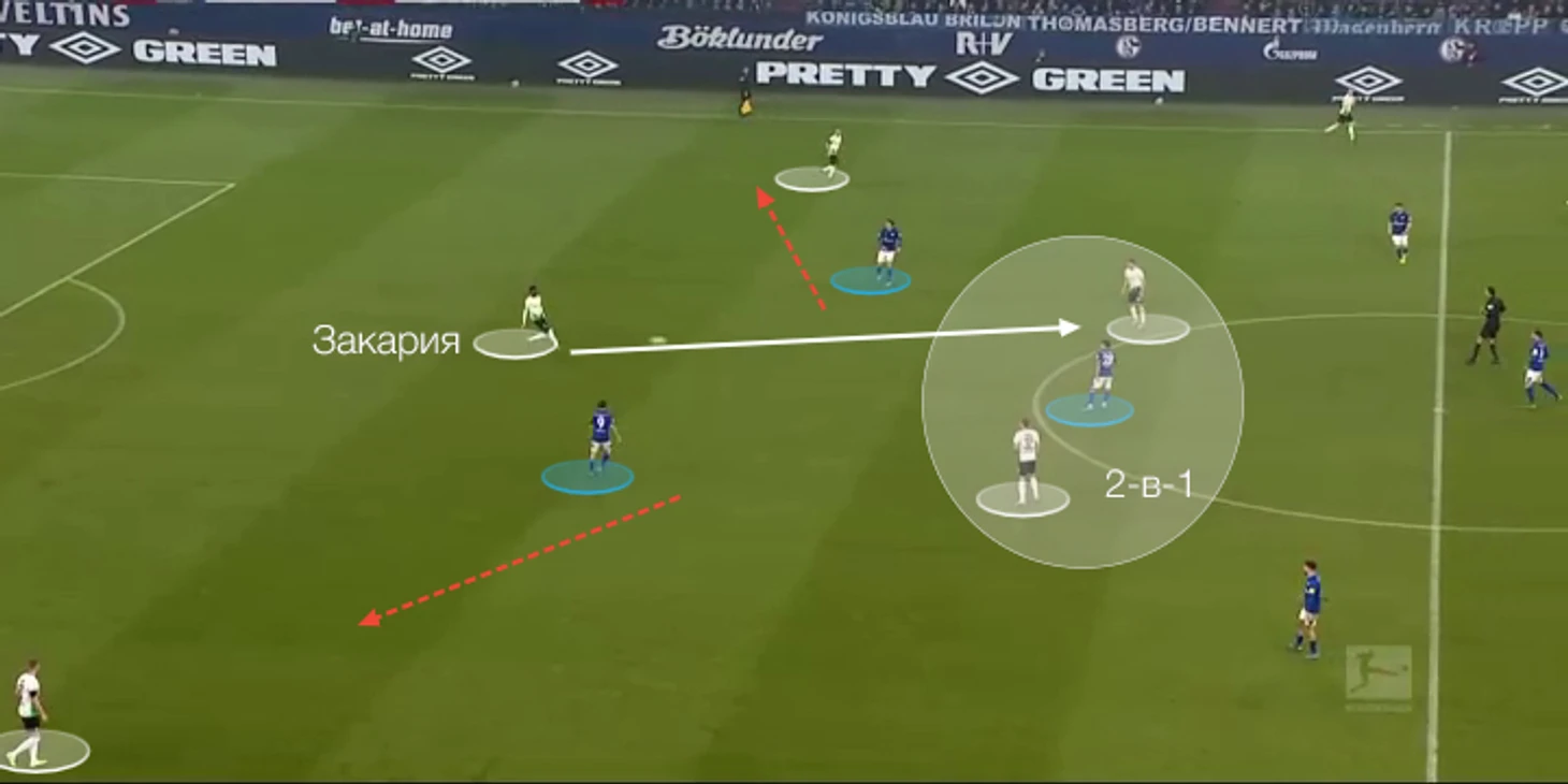 Второе. Если нападающие «Шальке» ориентировались в прессинге на крайних центральных защитников, то Закария направлял атаки через центр: