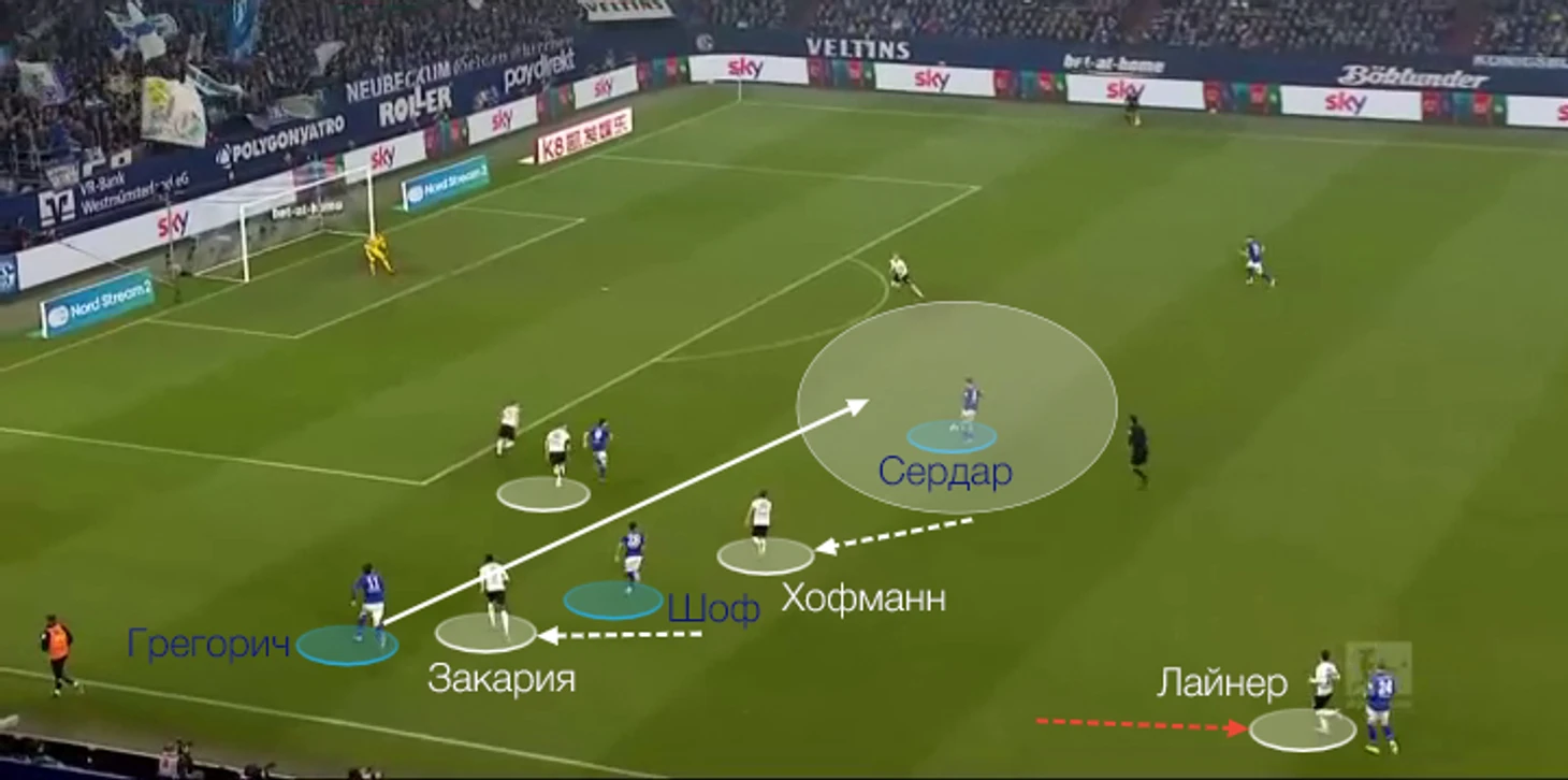 Отрезанного в высокой позиции правого защитника Лайнера бросился страховать Закария. Туда же стянулся и второй опорник гостей Хофманн, игравший по Шофу. Грегорич здорово разобрался с передачей на Сердара в опустевшую центральную зону.