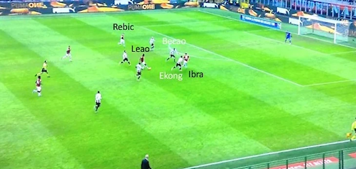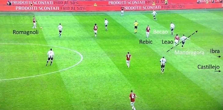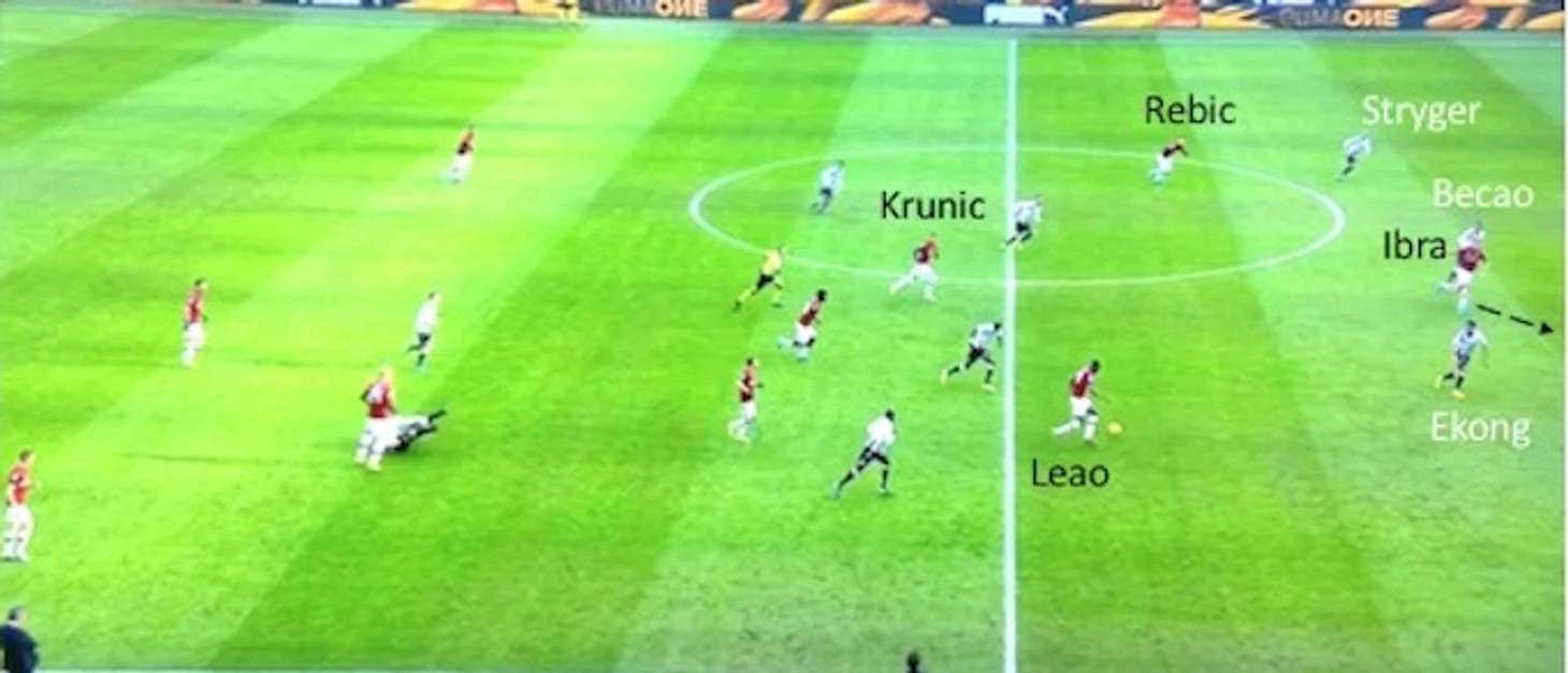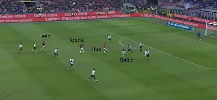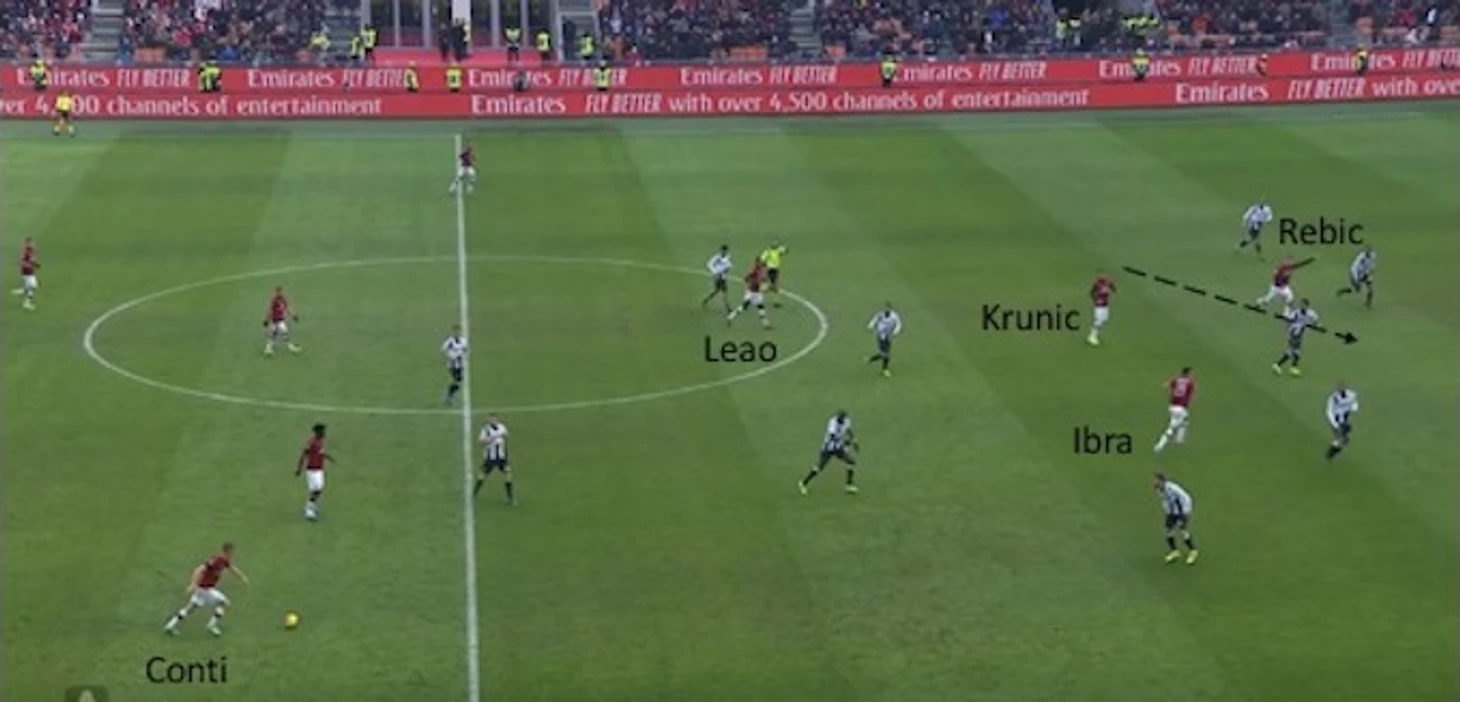 Также ниже приводится атака "Милана", начатая Романьоли с центра поля. В этом моменте Ребич выдергивает из своей зоны Бекао (одного из трех защитников "Удинезе"), а Ибрагимович стягивает на себя внимание двух остальных. Это позволяет Леау забежать за спину, покинувшему свою зону Бекао, что в последствии приводит к довольному опасному эпизоду.