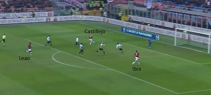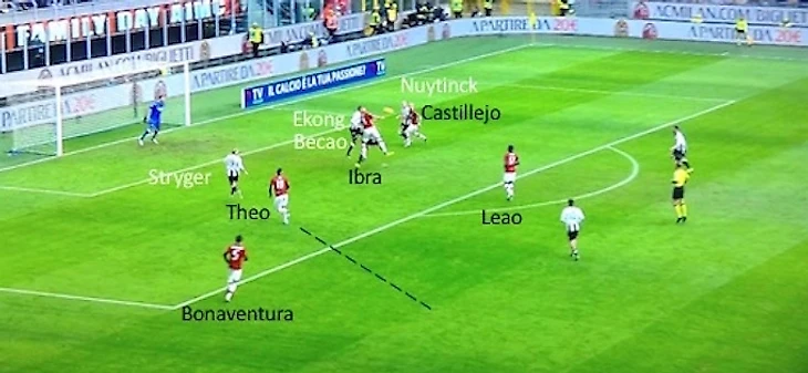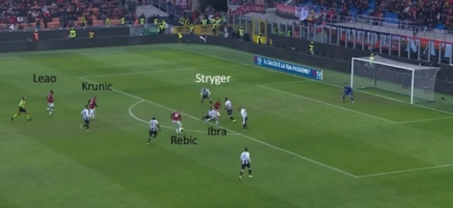 В этой позиции Ибра давит на центральных защитников "Удинезе", вынуждая их опускаться все ниже и ниже за ним, что позволяет открыть "коридор" для Леау.