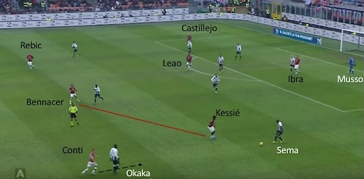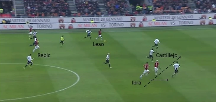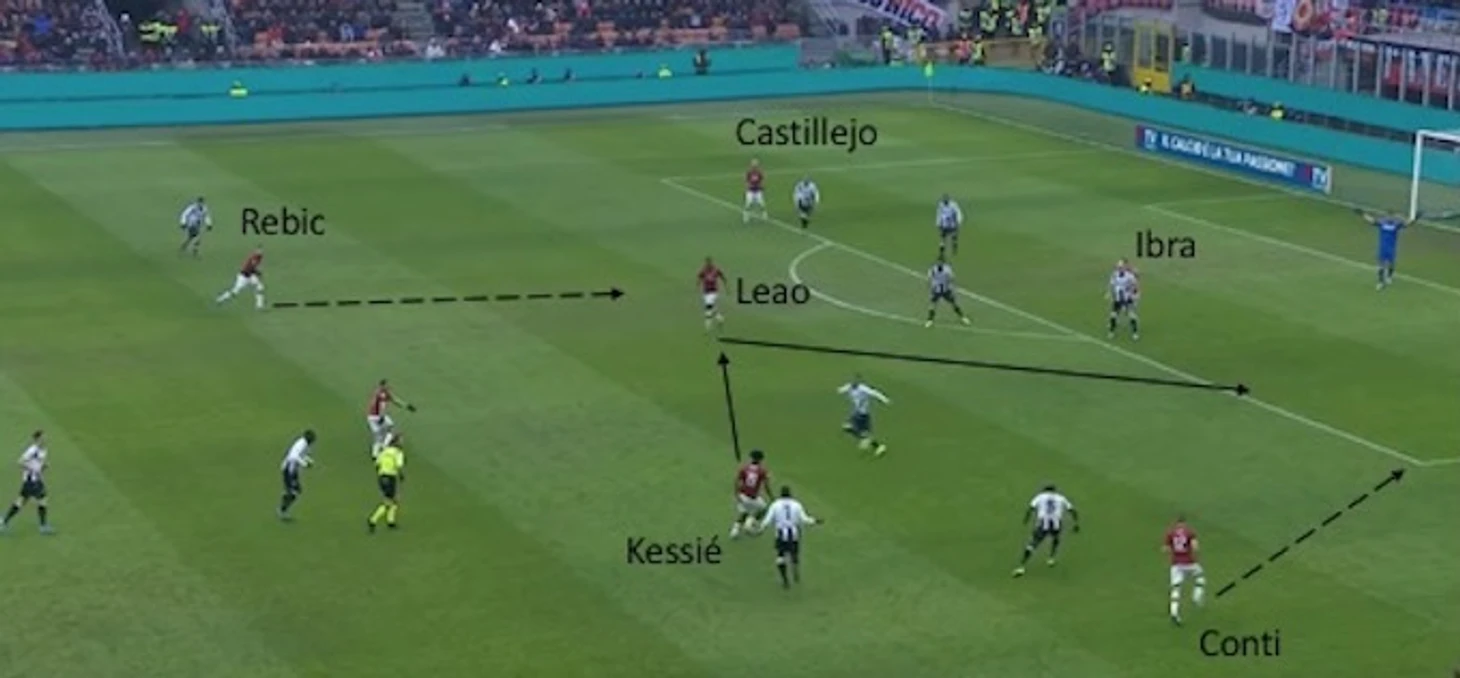 Далее Леау выдает шикарный пас на забегающего по флангу Конти. Стоит отметить, что португалец занимает позицию второго форварда, потому что Ибрагимович уже расположился в штрафной, стянув на себя защитника. Кастильехо также все еще находится в последней трети поля, в которую он вошел еще при прошлом эпизоде. Все это вкупе позволило Ребичу беспрепятственно подобраться к воротам.