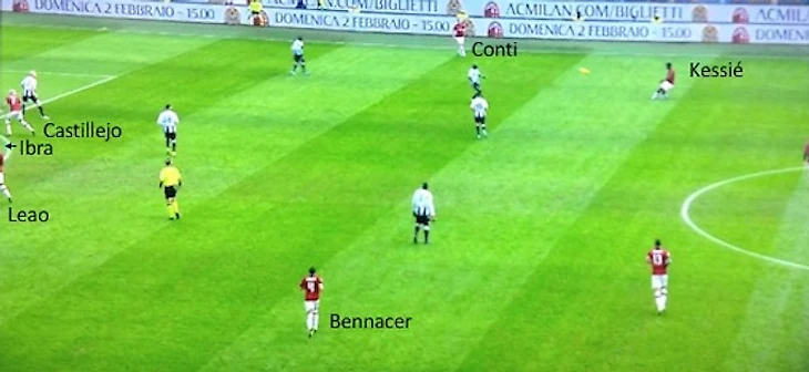 "Милан" учится использовать Ибрагимовича как путеводную звезду - и на поле, и вне его пределов. Если вы помните, именно Златан толкнул мяч в центр на Ребича в эпизоде с победным голом против "Удинезе". Но суть в том, что игроки в принципе стали чаще забрасывать мяч вперед на шведского форварда. Вот эпизод, где Кессье запускает мяч в область Ибры.