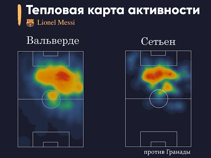 После этих слов у каждого фаната сине-гранатовых должно немного екнуть сердечко, но это именно так! У такой смены позиции Лео может быть много причин, одна из которых – травма Луиса Суареса. Эль Пистолеро точно не играл бы ложную девятку, да и Гризманн вряд ли смог бы, но к чему эти сложности, когда есть Месси, да еще и в хорошей форме? В матче против «Гранады» предматчевый состав нам показали как 4-3-3, где Месси справа, Гризманн в центре, а Фати слева. При Вальверде было бы именно так, только с переходом на 4-4-2 в защитной фазе. Признаюсь честно, я думал, что так оно и будет, но спустя небольшой отрезок игры я понял, что все совсем иначе. Фати разгонял справа, Гризманн пытался играть в центре, когда подключался Альба, чтобы ему не мешать, но в основном отыгрывал слева. А вот Месси, то и дело, находился в центре между линиями обороны и полузащиты соперника, как в старые гвардиоловские времена. Даже гол каталонской команда – максимально барселонский, и как символично, что именно Лео стал его автором. В подтверждение моих слов могу привести тепловую карту, где слева вы можете видеть усредненную позицию аргентинца при Вальверде, а также при Сетьене (справа):