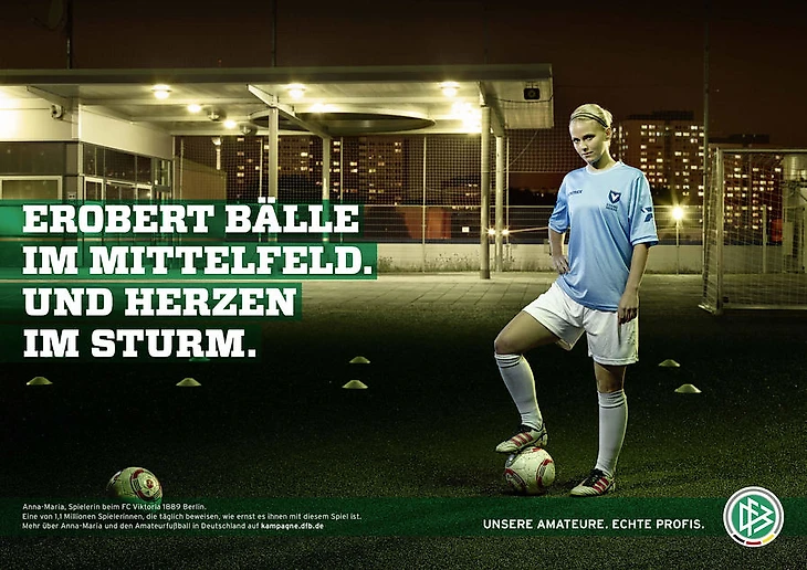 Перевод: «Завоёвывает мячи в полузащите. И сердца в нападении. Анна-Мария, игрок FC Viktoria 1889 Berlin. Одна из 1,1 миллионов женщин, которые ежедневно доказывают, как серьёзно они подходят к этой игре»