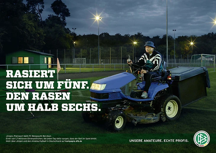 Перевод: «Стрижёт себя в пять. Газон – в полшестого. Юрген, садовник FC Bergwacht Berzbuir. Один из 1,7 миллионов добровольцев, которые ежедневно следят за тем, чтобы мяч оставался в поле.»