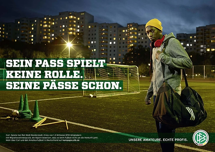 Перевод: «Его Пасс(Паспорт) не играет никакой роли. Его пасы – всё же. Карл, игрок Rot-Weiss-Norderstadt. Один из 1,3 миллионов членов DFB с прошлым миграции, которые ежедневно доказывают, что в футболе неважно происхождение.»